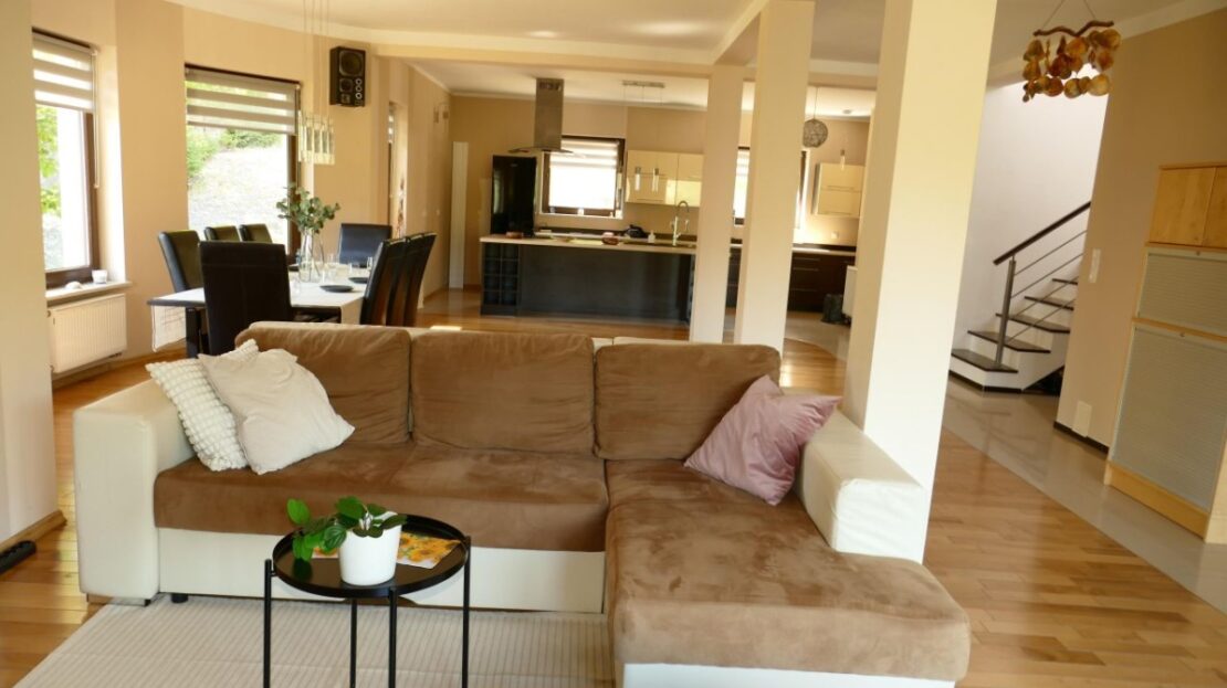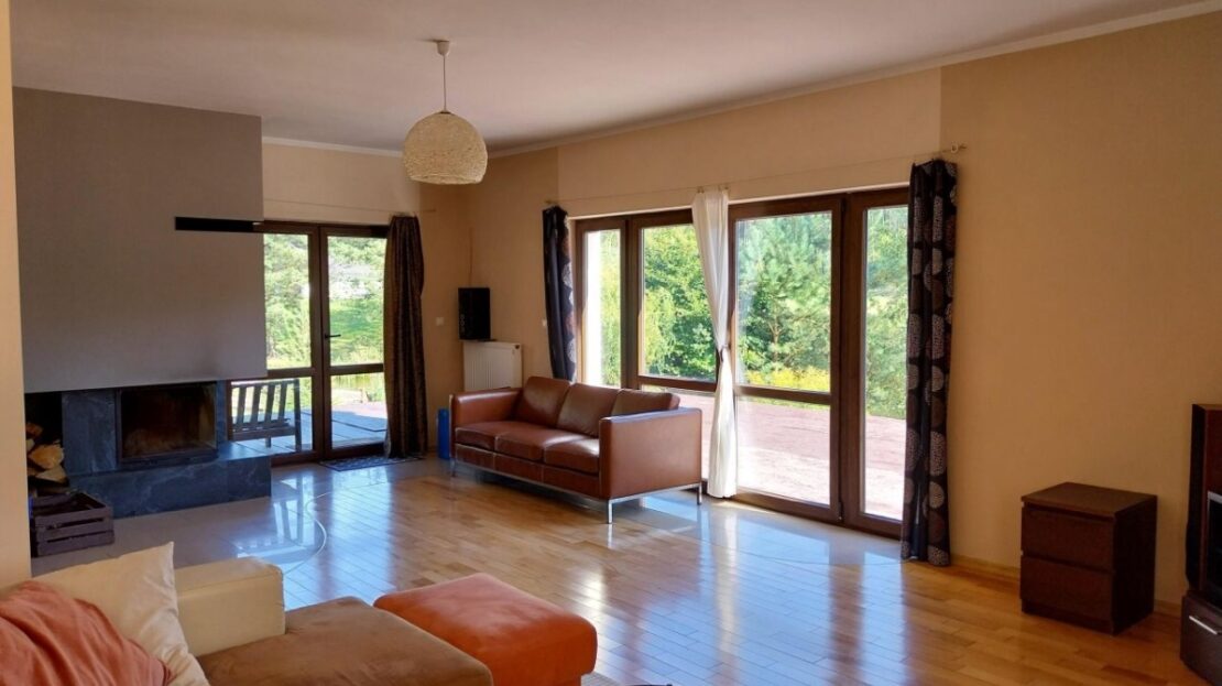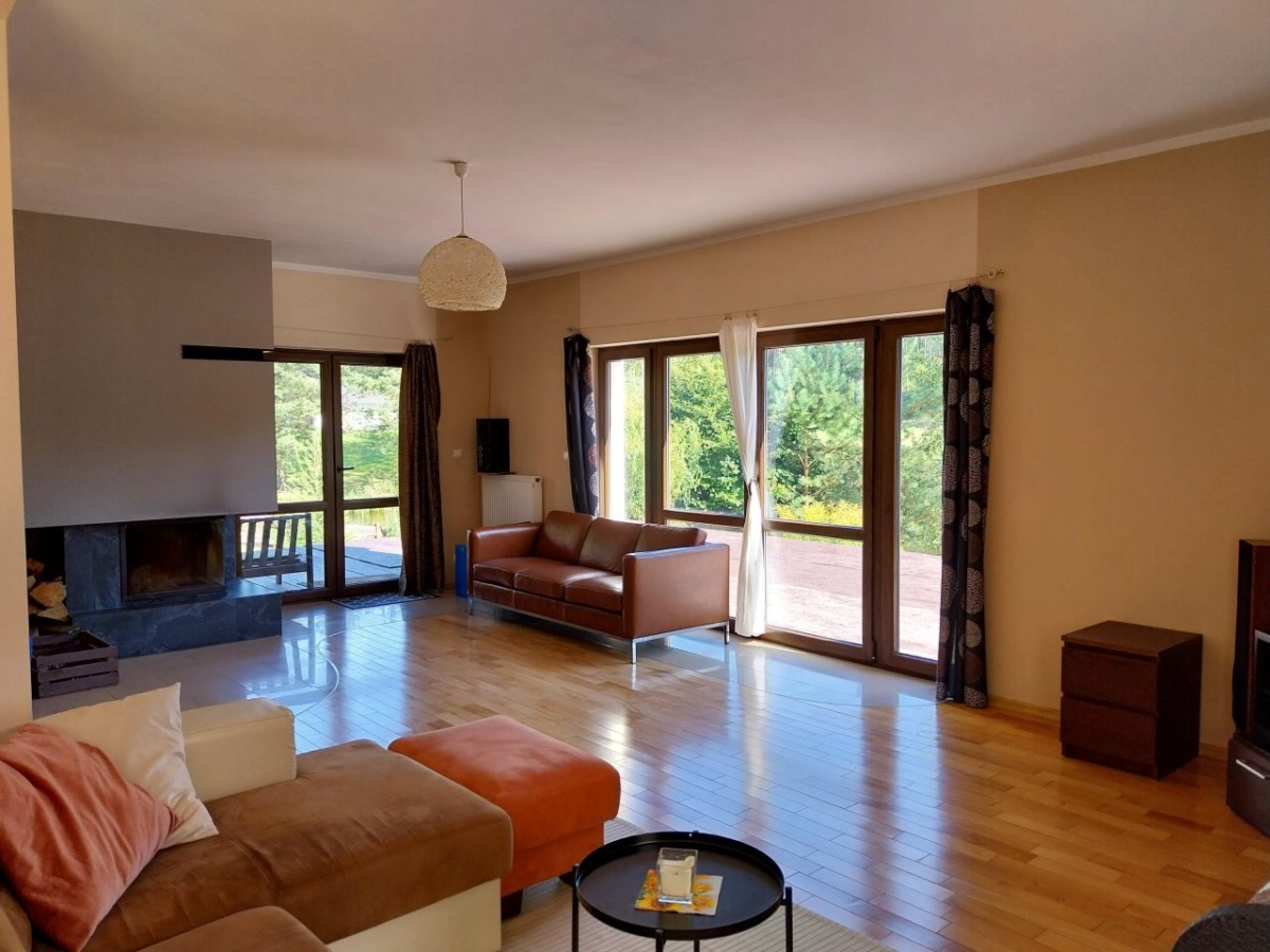 – salon – 35,5 m2: z kominkiem z dużymi oknami tarasowymi