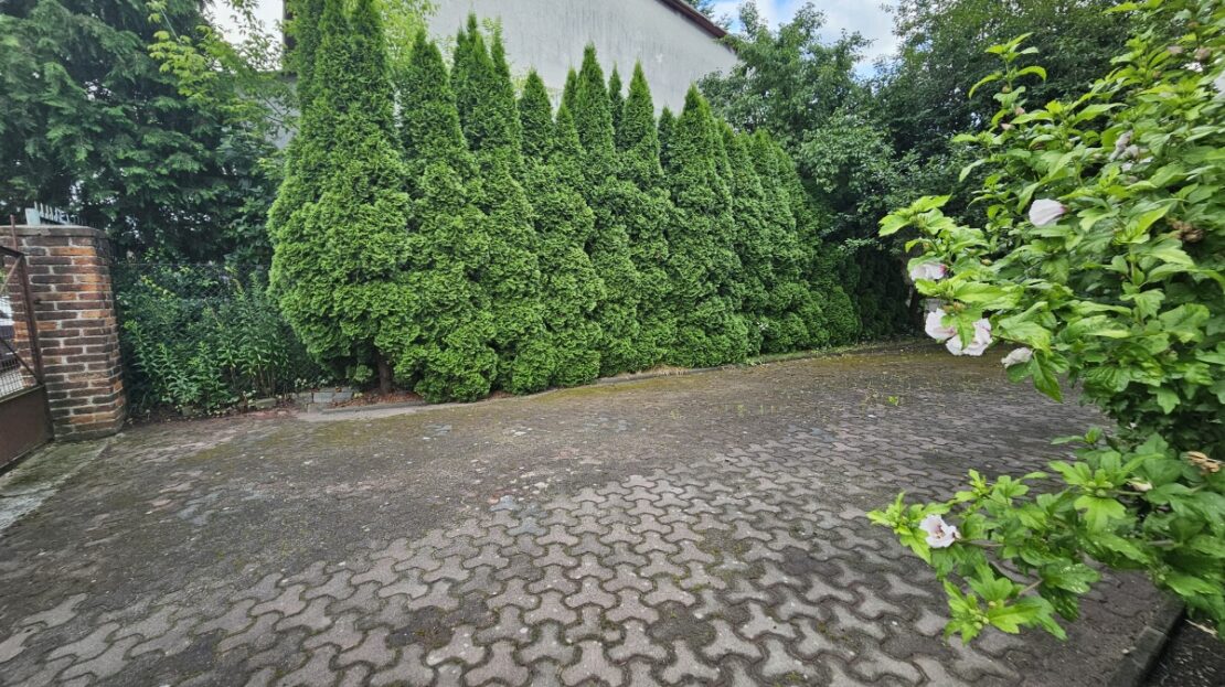Działka narożna z wjazdami z dwóch stron o powierzchni 726 m², ogrodzona częściowo betonowym płotem oraz siatką. Na działce znajdują się budynki gospodarcze (70 m²) z opcją przekształcenia ich na mieszkalne. Są też liczne nasadzenia (wiśnie, grusza, śliwka, rozległe krzaki jeżyn) oraz rząd wysokich tuj zapewniających prywatność. Podwórko częściowo wyłożone kostką brukową. W centralnej części działki znajduje się szklarnia osadzona na betonowych fundamentach.