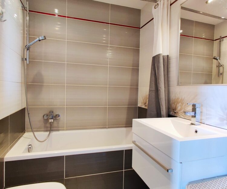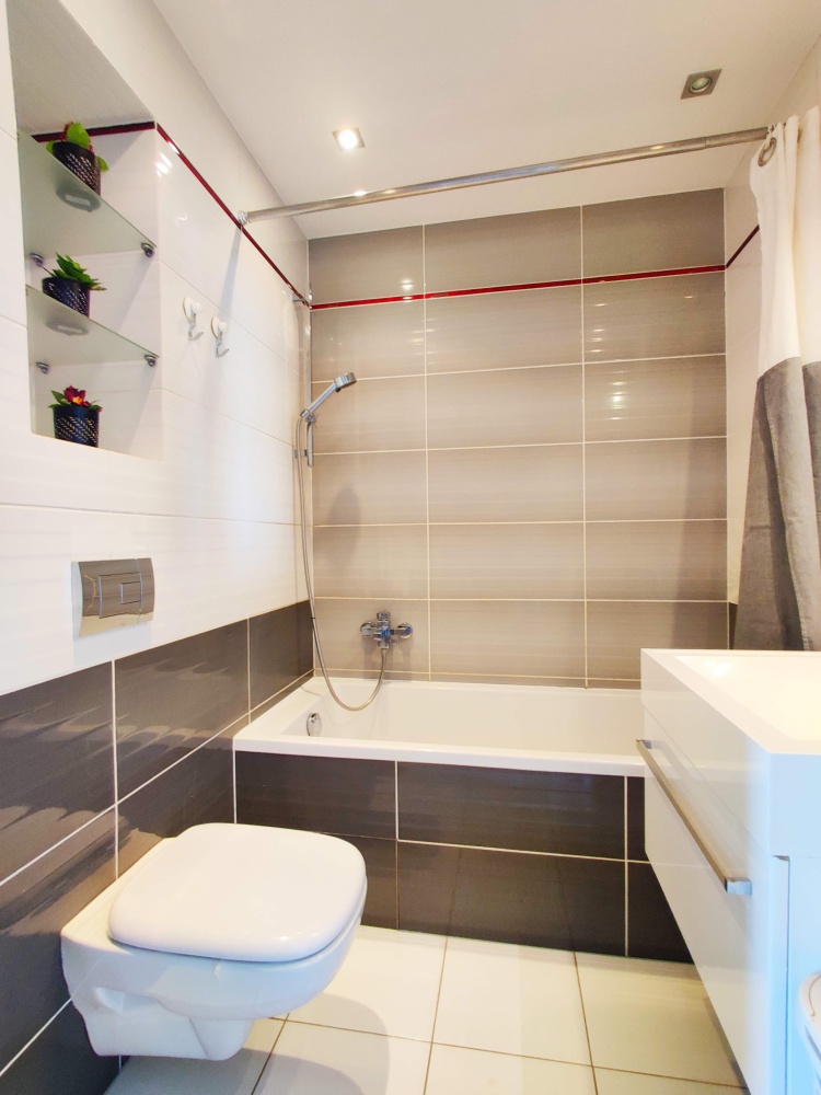 łazienka: duża wanna z zestawem prysznicowym, lustro zabudowane z oświetleniem, WC zabudowany Koło SLIM, wnęka z półkami, szafka z szufladami i wbudowaną umywalką, sufit obniżany z oświetleniem halogenowym (4 halogeny), cała łazienka w kaflach, drzwi z przeszkleniem matowym z zamkiem