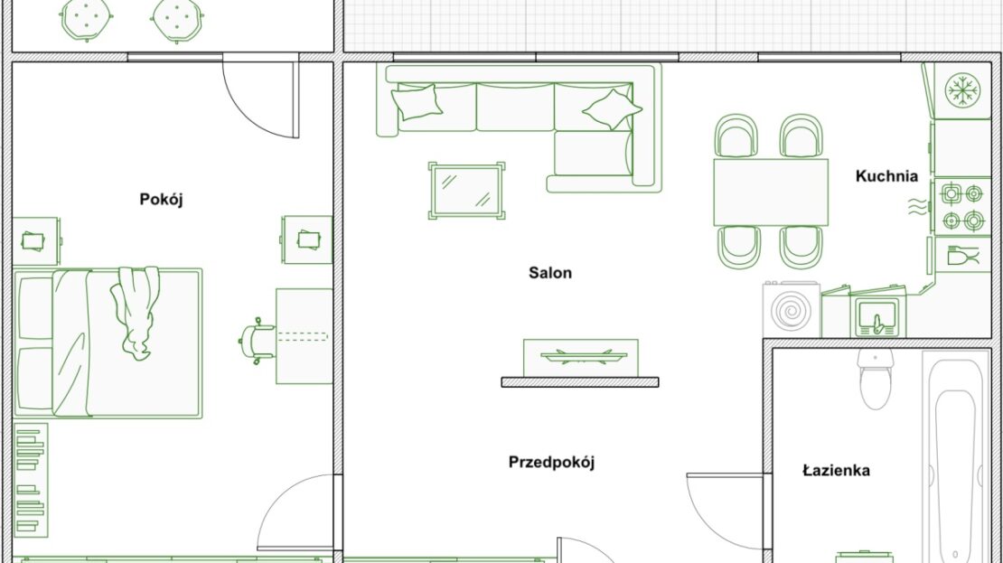 salon z aneksem kuchennym: meble – zabudowa RTV z zestawem audio, uchwyt TV regulowany, duży narożnik z funkcją spania i miejscem na przechowywanie Agata Meble, stolik kawowy, kuchnia w zabudowie na wymiar (zmywarka, płyta gazowa, okap podszafkowy, piekarnik, mikrofalówka, lodówka z zamrażarką, pralka) wszystkie sprzęty marki WHIRLPOOL, duży i głęboki zlew, stół z czterema krzesłami, systemy zabudowy kuchennej Blum, zabudowa z maksymalnym wykorzystaniem przestrzeni, miejsce na przechowywanie butelek z winem/wodą itp. (30 butelek), sufit nieobniżany w celu maksymalizacji przestrzeni – oświetlenie: plafony, oświetlenie wieczorne/TV – lampy nad zabudową,