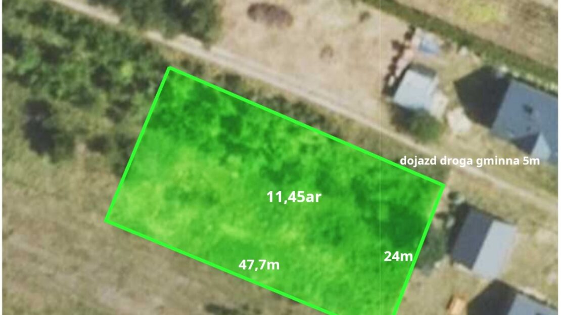 Działka budowlana o pow. 11,45ar o wymiarach 47,7m x 24m, płaska o kształcie prostokąta. Działka z pozwoleniem na budowę i gotowym projektem domu (dom parterowy APS 245). Przeprowadzone badania geologiczne.