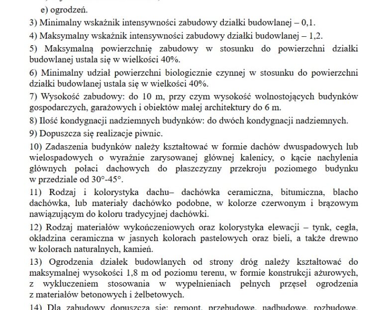 – Intensywność zabudowy 0,10–1,20, wysokość budynków do 10 m (2 kondygnacje)