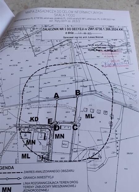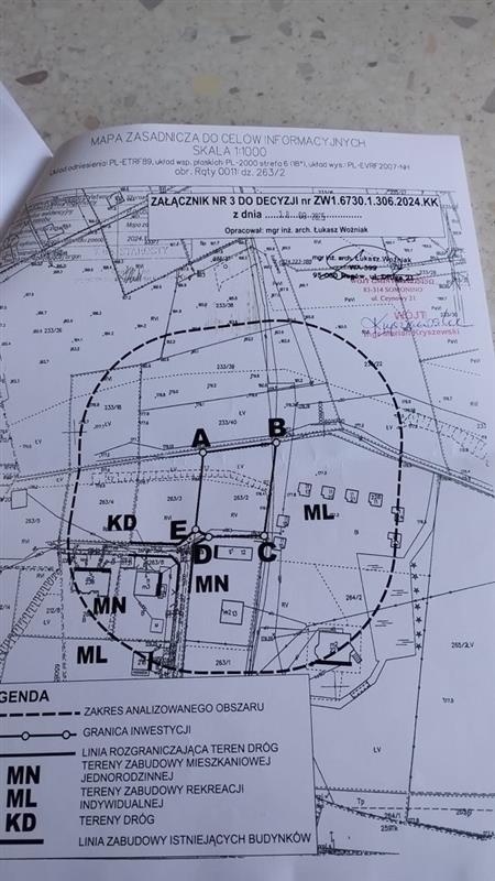 warunki zabudowy dla budynku mieszkalnego jednorodzinnego, pow. zabudowy w stosunku do powierzchni terenu inwestycji nie mniej niż 11,65% – maks. 17,77%. Pow. budynku mieszkalnego od 70m kw do 118 m kw, oraz budynku garazowego od 50 m kw do 65 m kw, szerokość elewacji frontowej 10 m tolerancja 20%, dach dwuspadowy o kącie nachylenia 25-45%, wys. kalenicy 6m do 9 m