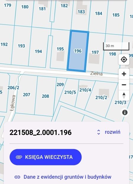 Numer ewidencyjny: 196, klasa gruntu: Vb, wymiary działki 20 m x 45m.