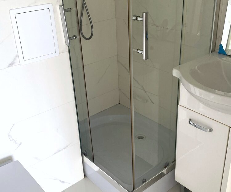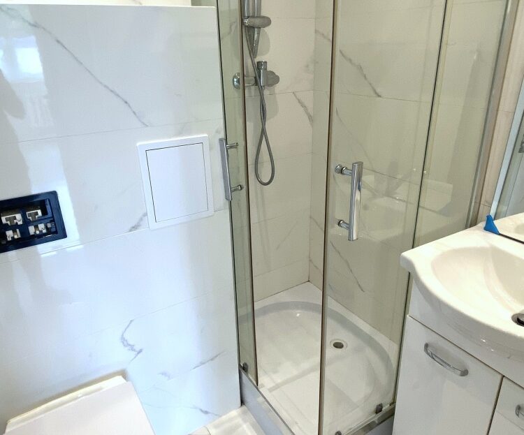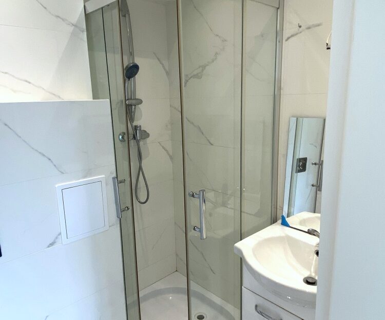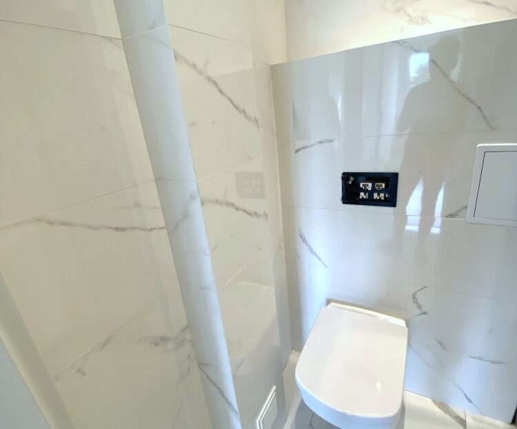 Łazienka w modnych płytkach, z kabiną prysznicową oraz kompaktem WC w zabudowie.( na zdjęciu brak przycisku do WC, który będzie uzupełniony).