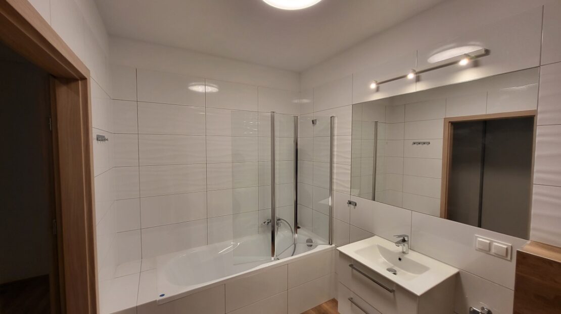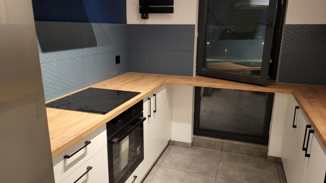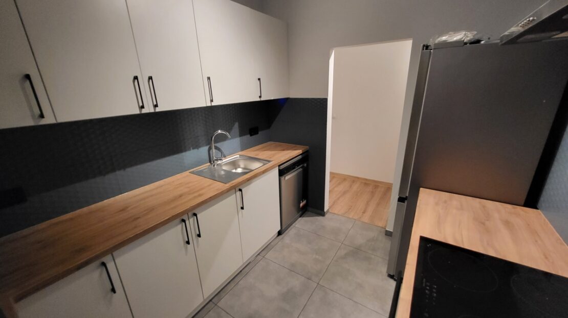 – Kuchnia: lodówka, płyta indukcyjna, piekarnik, okap, zmywarka, płytki ceramiczne na podłodze i ścianach