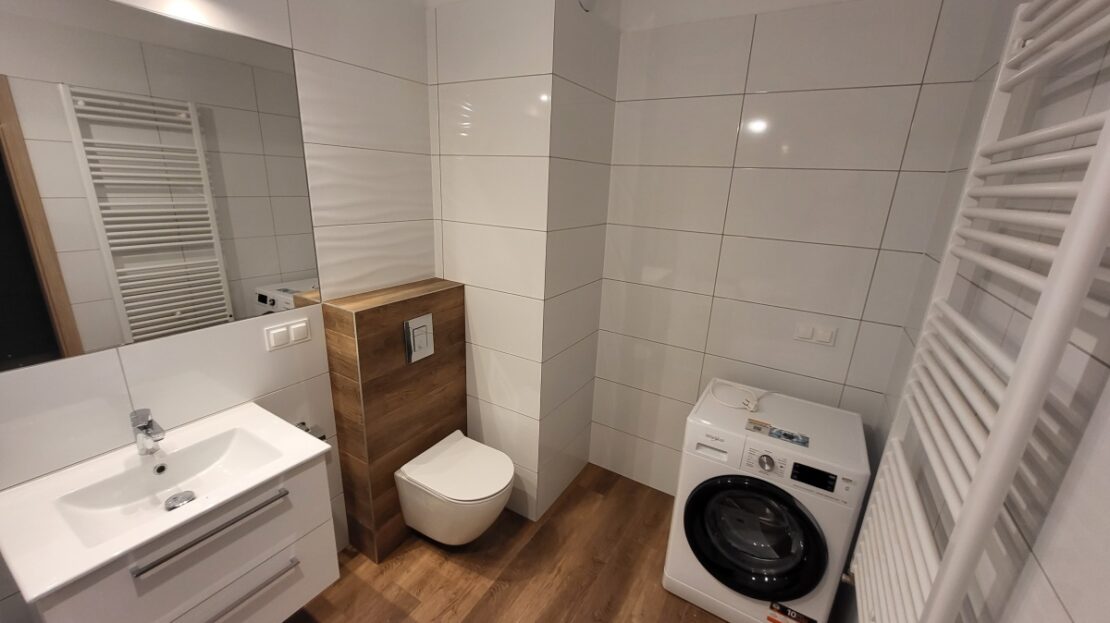 – Łazienka: pralka, biały montaż, płytki ceramiczne na podłodze i ścianach