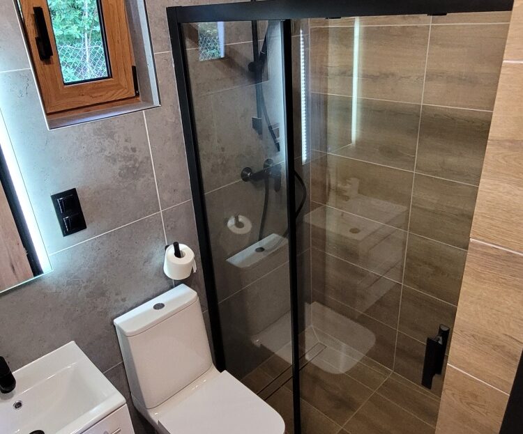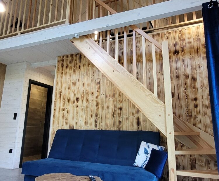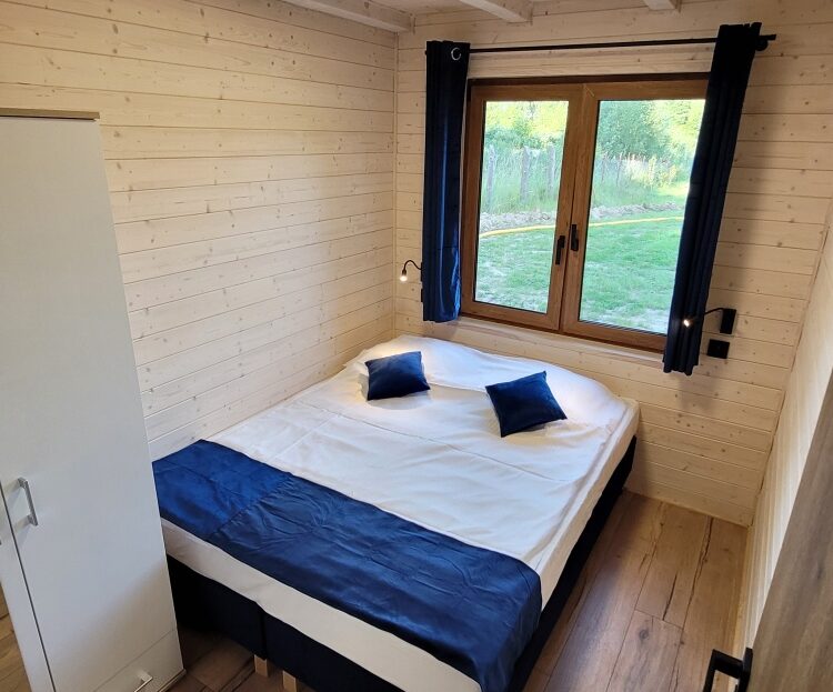 Po jednej stronie stawu znajduje się opisany wyżej dom mieszkalny wraz z garażami, a po drugiej stronie stoją dwa domki caloroczne o powierzchni zabudowy 35m² każdy, obydwa wybudowane w 2023. Powierzchnia po podłodze każdego domku wynosi ok 40m². Są to dwa identyczne domki, murowane i ocieplone z antresolą, wykończone w wysokim standardzie. Kazdy z domków: salon z aneksem kuchennym, łazienka, sypialnia + druga sypialnia na antresoli.