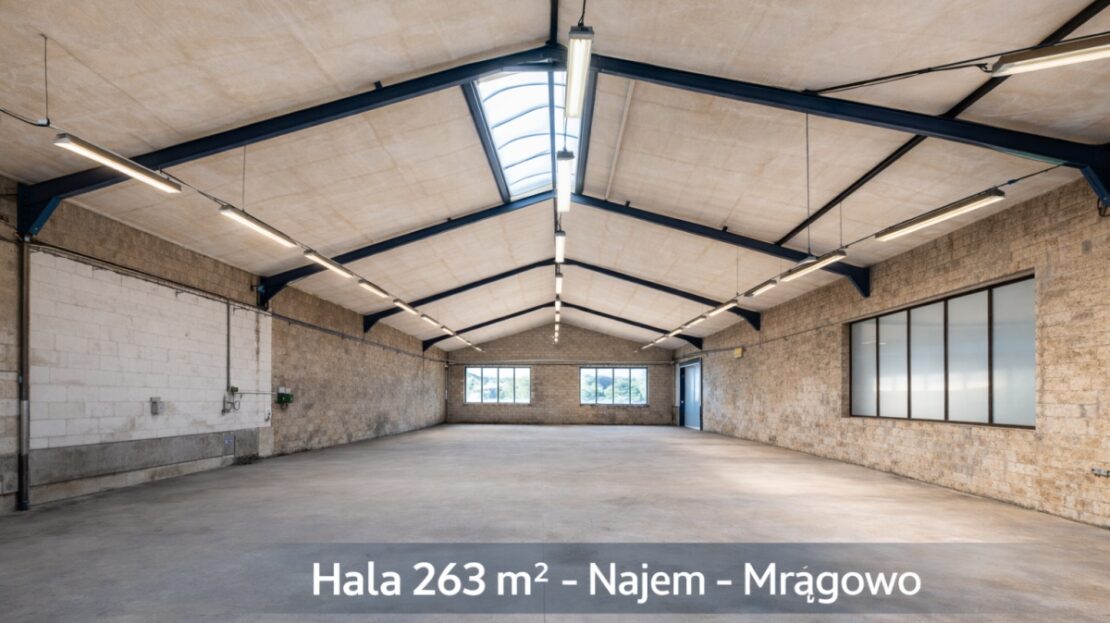 Do wynajęcia hala produkcyjno-magazynowa o powierzchni 263 m² zlokalizowana przy ul. Giżyckiej 9 w Mrągowo.