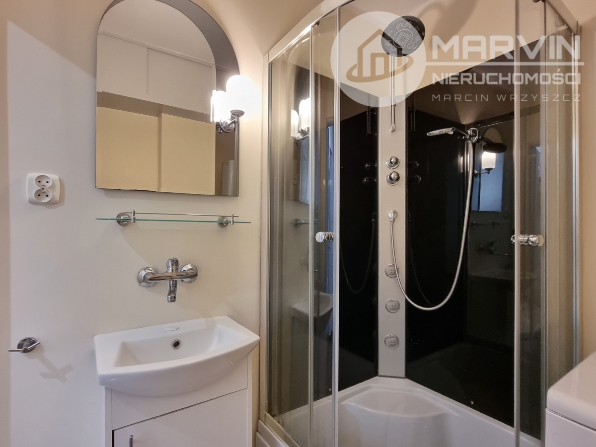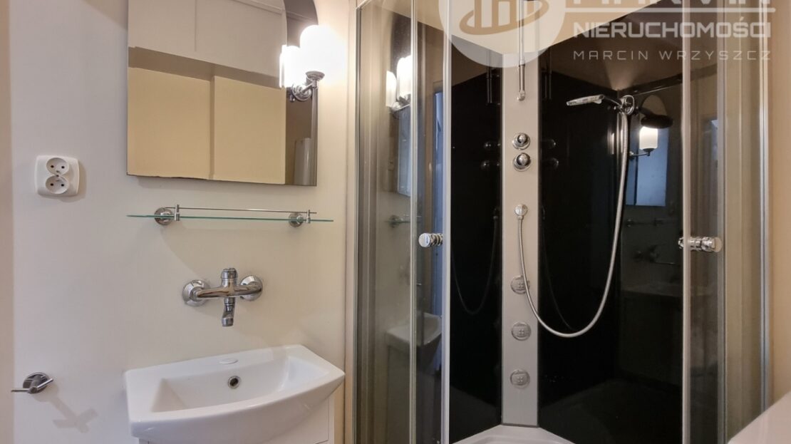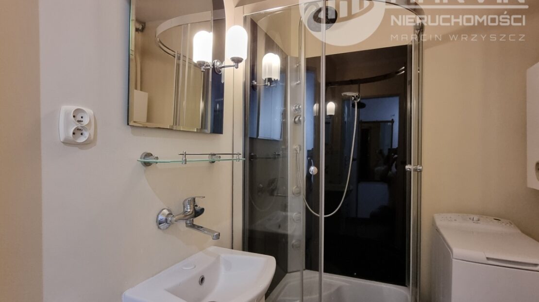Łazienka – kabina prysznicowa z hydromasażem, umywalka z szafką, lustro, półki.
