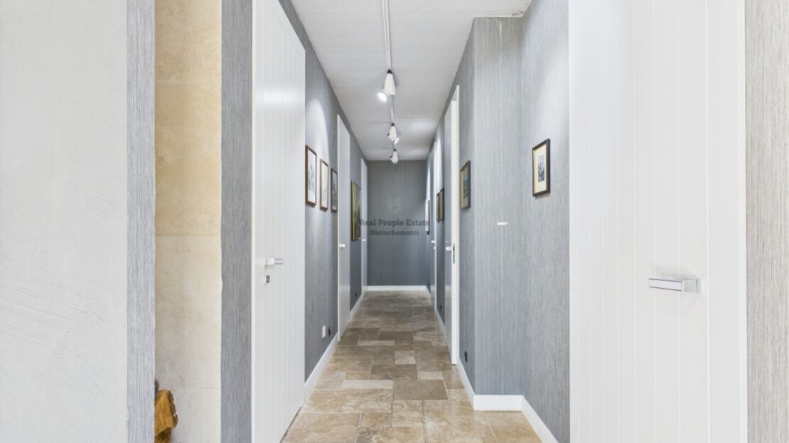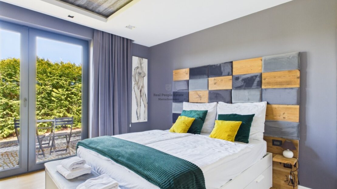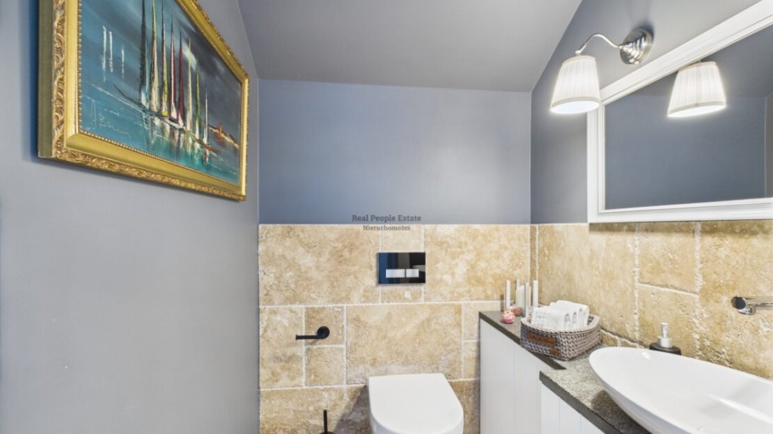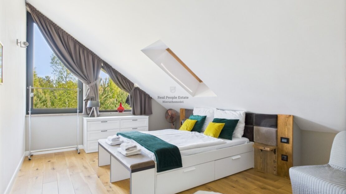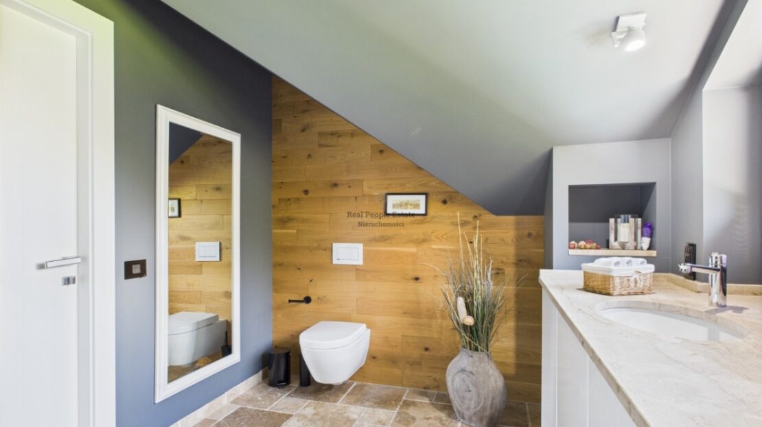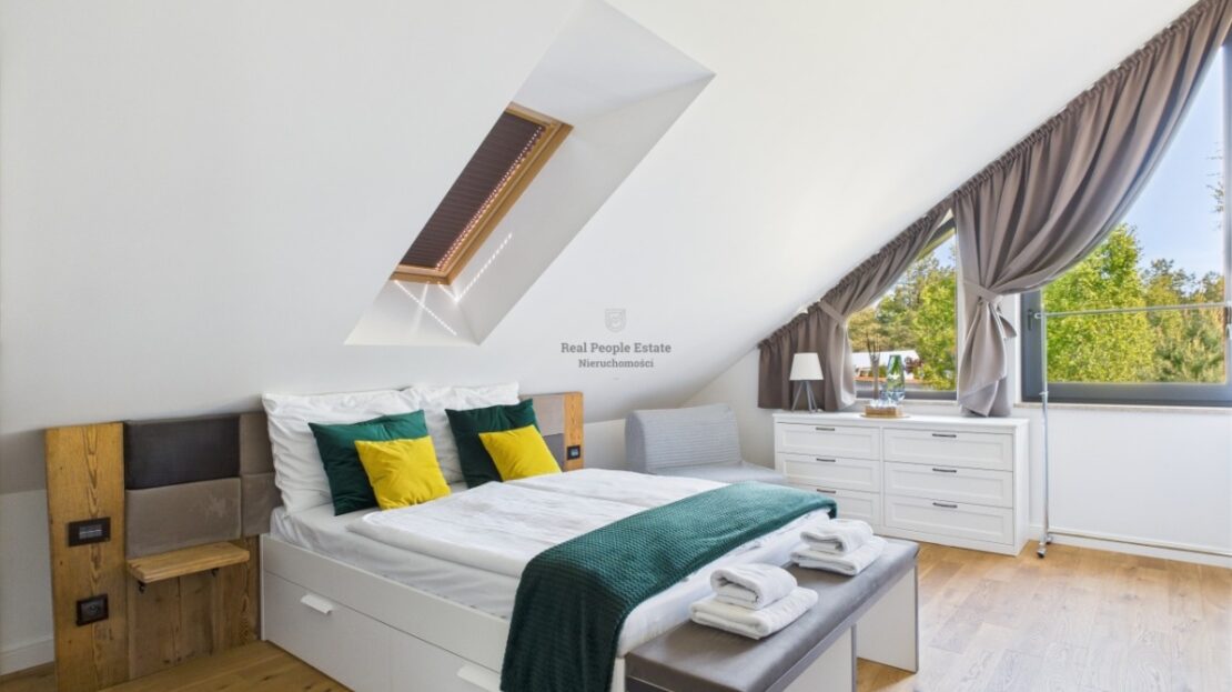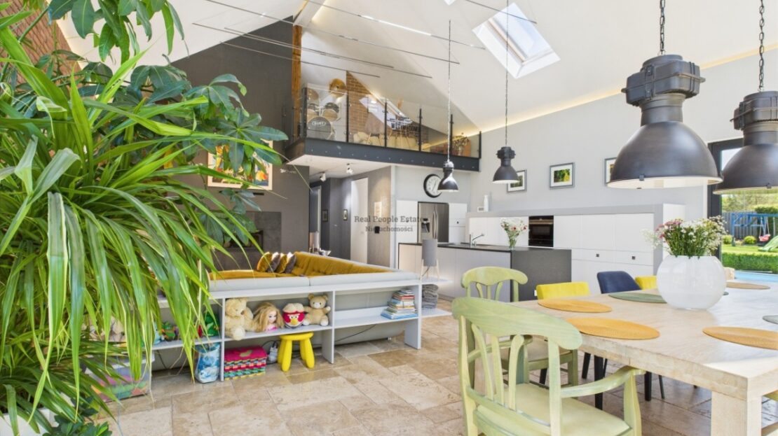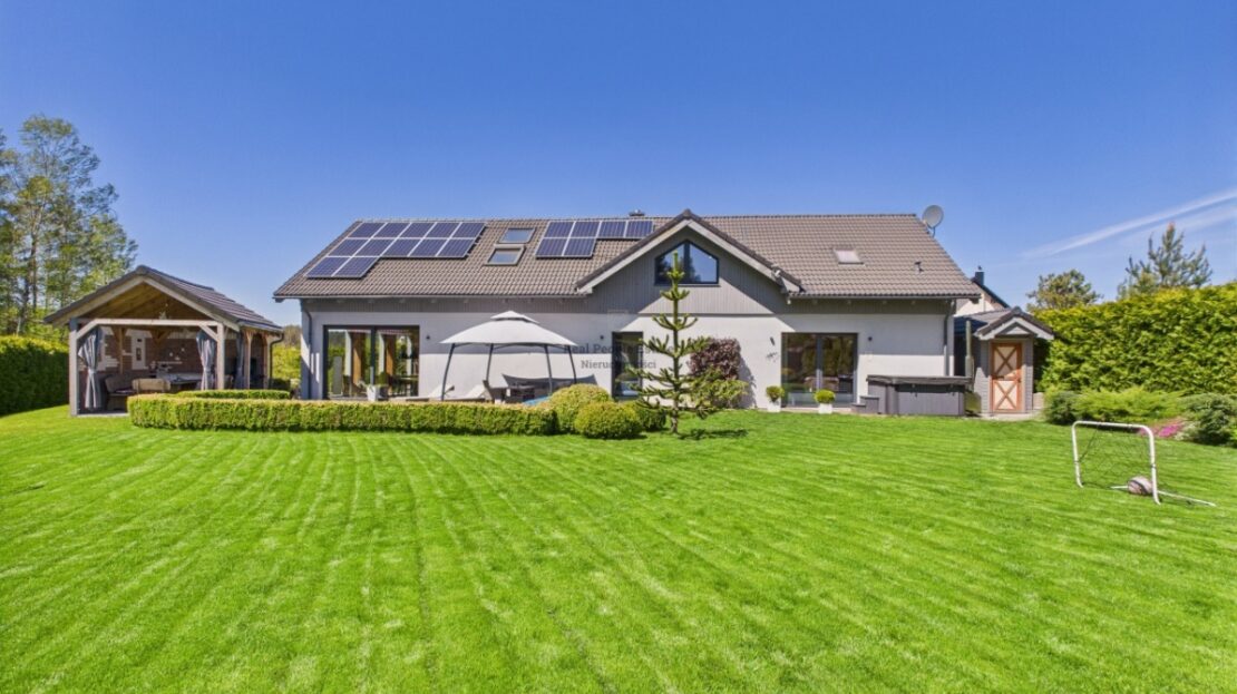 Dom o powierzchni użytkowej 195,33 m² (całkowita 213,93 m²) został wybudowany w 2018 roku. Funkcjonalny układ oferuje 4 sypialnie, przestronny salon z kominkiem połączony z nowoczesną kuchnią, 2 łazienki oraz dodatkową toaletę i 2 pomieszczenia gospodarcze. Całość została wykończona w bardzo wysokim standardzie – podłoga w pokojach wyłożona panelami drewnianymi, pozostałe pomieszczenia kamieniem naturalnym.