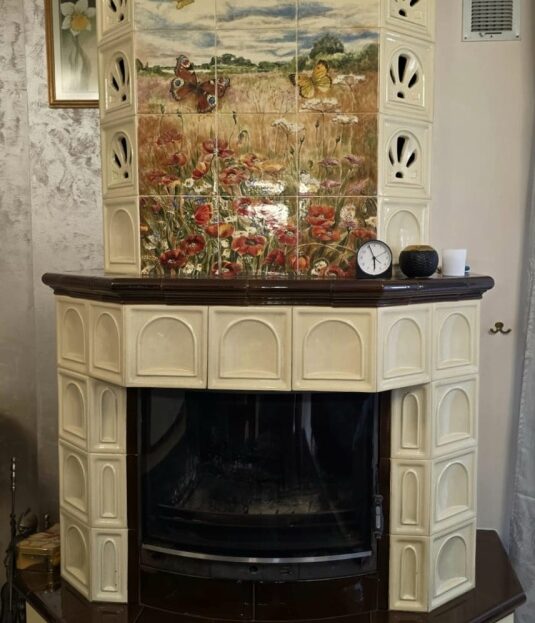 • stylowy kaflowy kominek z ręcznie malowanymi kaflami i rozprowadzeniem ciepła na poddasze,