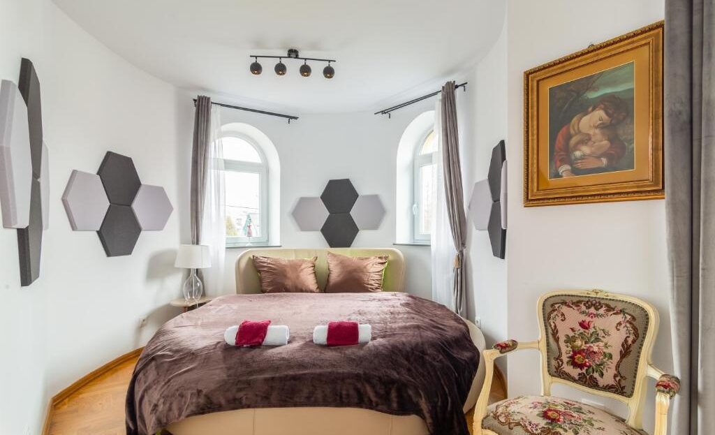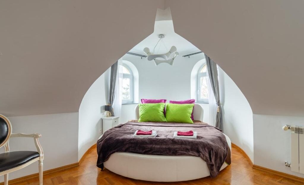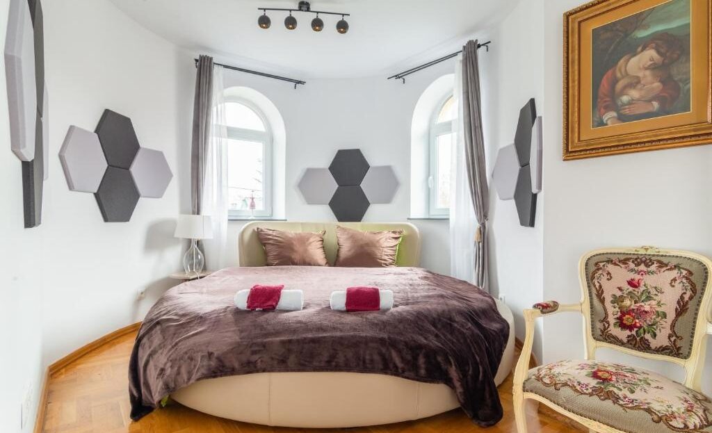 wygodnymi łóżkami kontynentalnymi lub okrągłymi łóżkami queen o średnicy ponad 2,5 m,