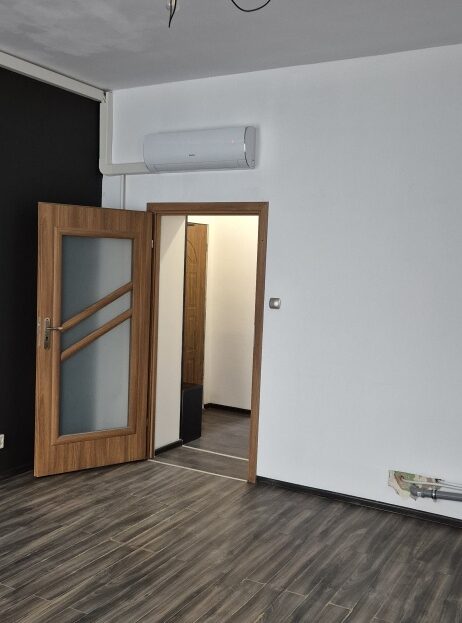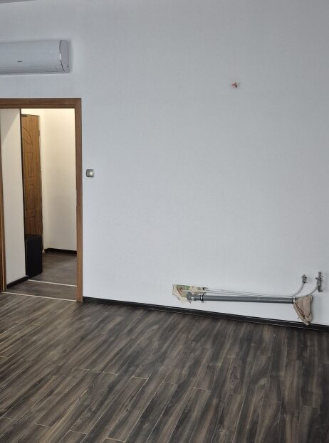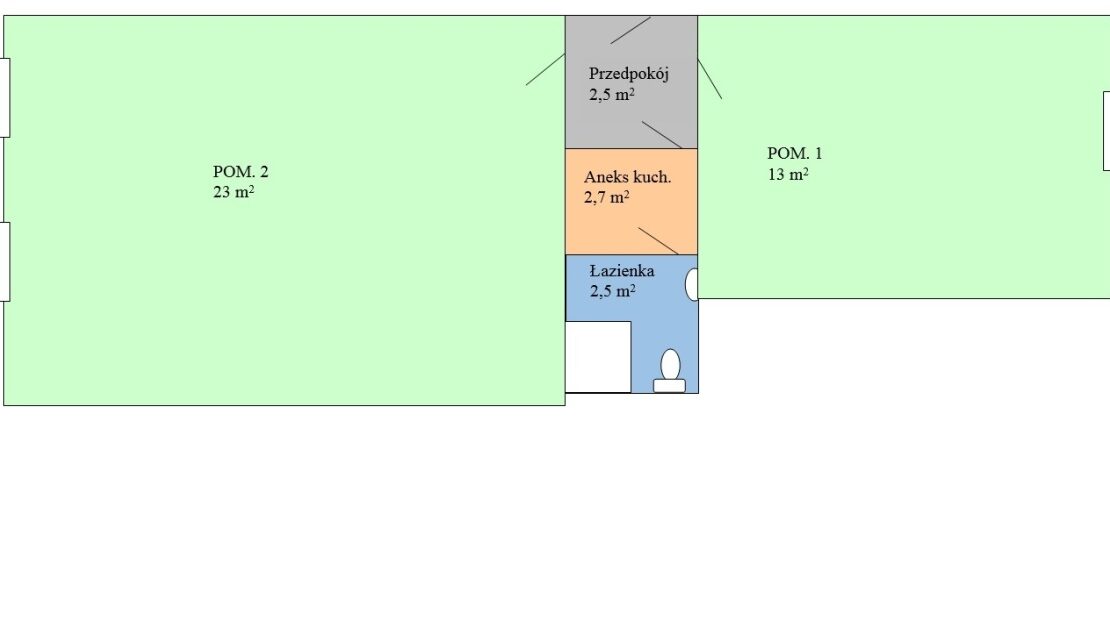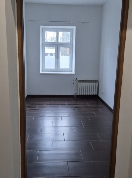 Mieszkanie składa się obecnie z dwóch pomieszczeń głównych – 25m2 i 18m2 oraz przedpokoju i łazienki. W większym pokoju wyprowadzone media pod aneks kuchenny.