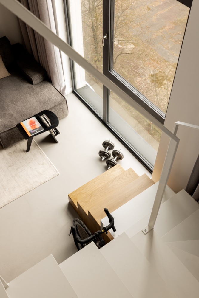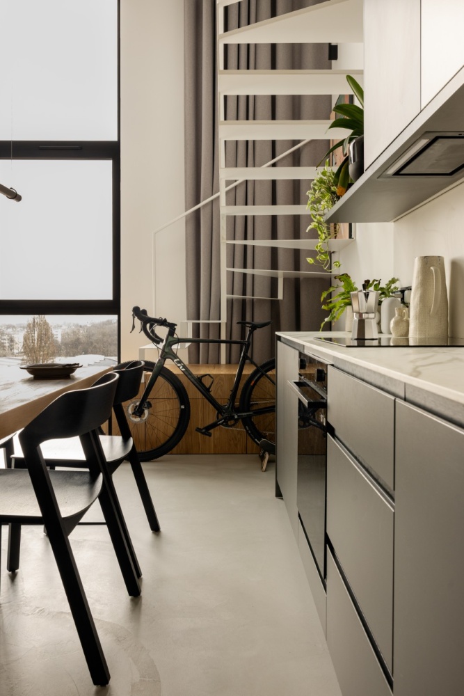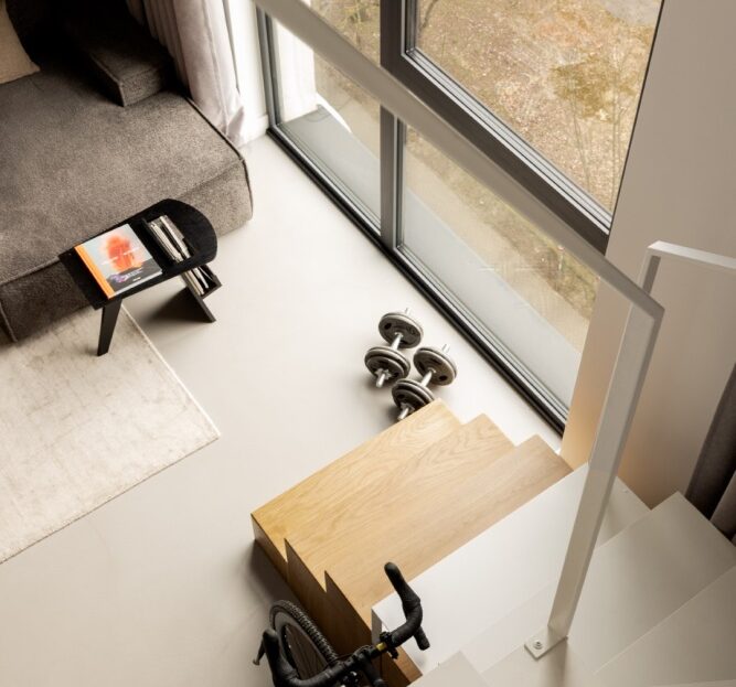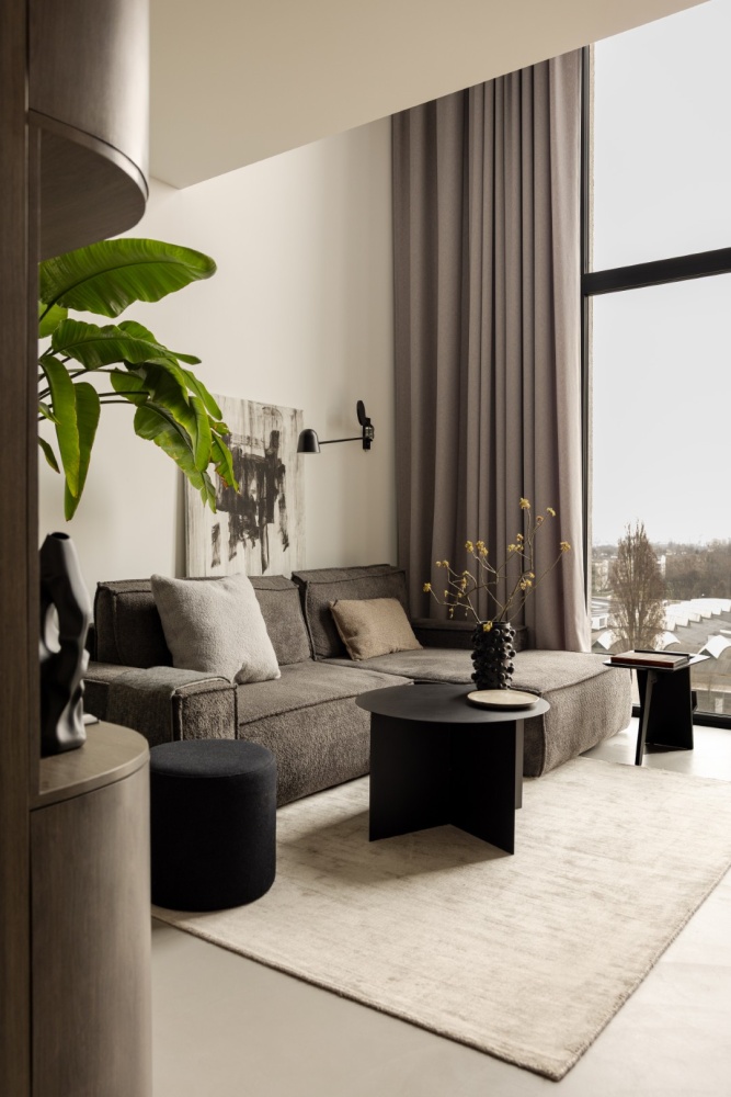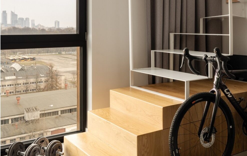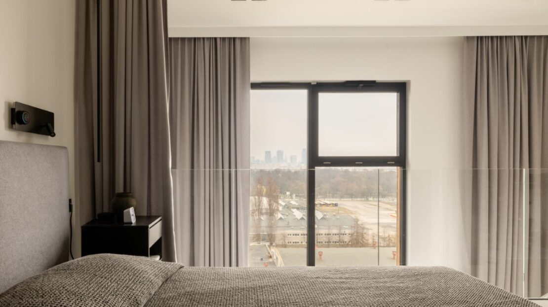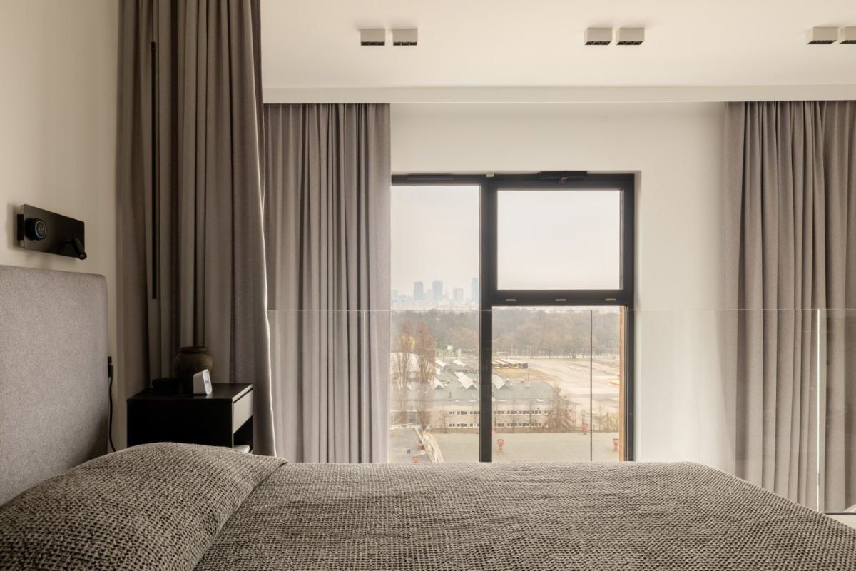 Dwupoziomowy układ – wysokość apartamentu sięga aż 5,8 m w salonie i 2 pełne kondygnacje po 2,75 m wysokości Olbrzymie panoramiczne okno (ok. 5,3 x 2,2 m) z elektrycznym otwieraniem górnego okna;