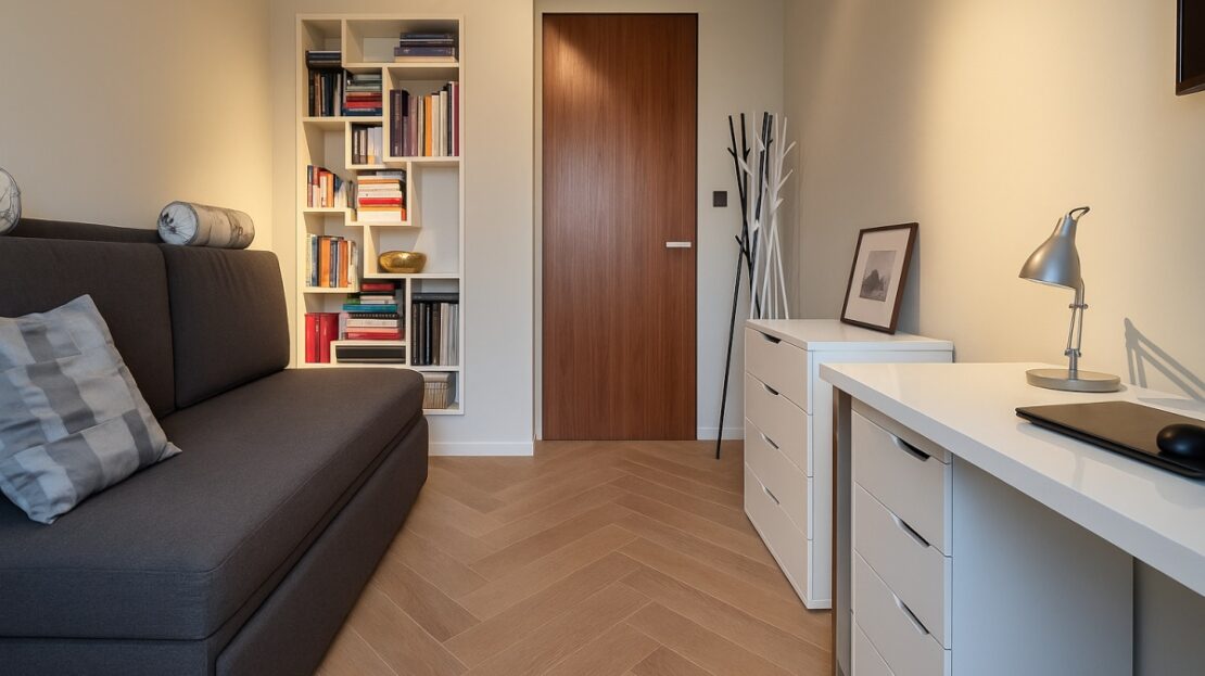 -garderoba 10 m² – aktualnie w układzie master bedroom – wejście bezpośrednio z sypialni, pełni funkcję dużej prywatnej garderoby.