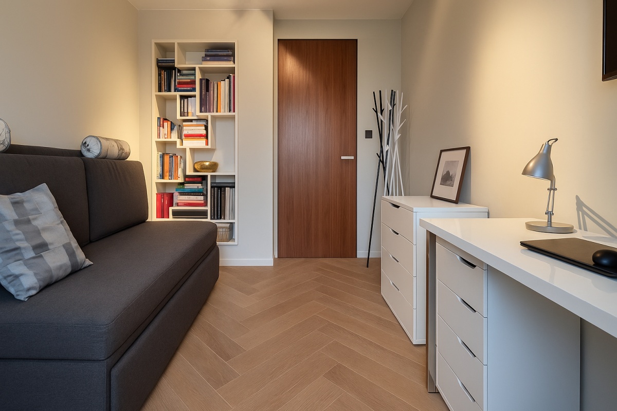 Pomieszczenie garderoby można łatwo przekształcić w samodzielny pokój z wejściem od strony korytarza wraz z wyjściem na balkon — idealny na: