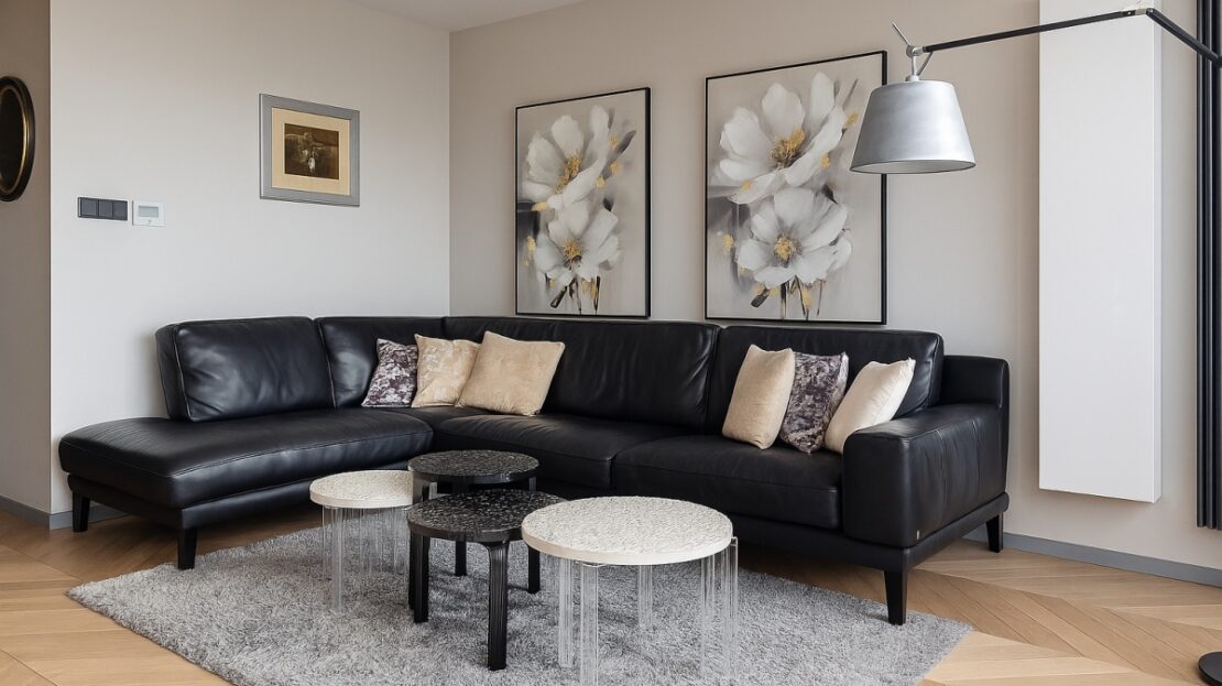 -przestronny salon z włoską skórzaną sofą Natuzzi,