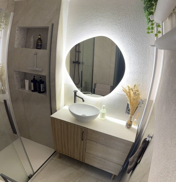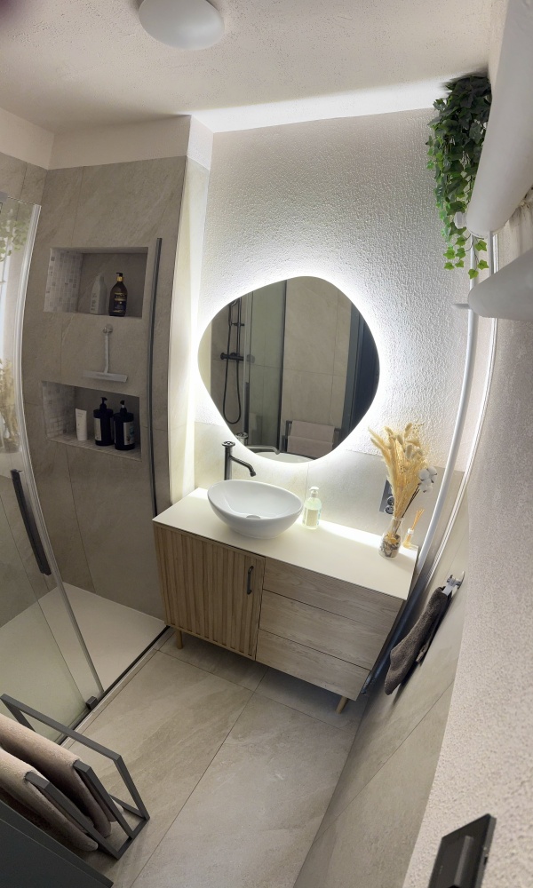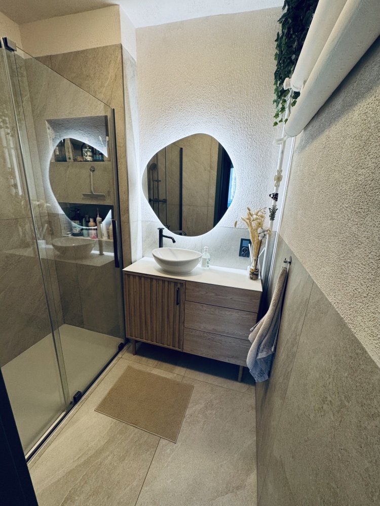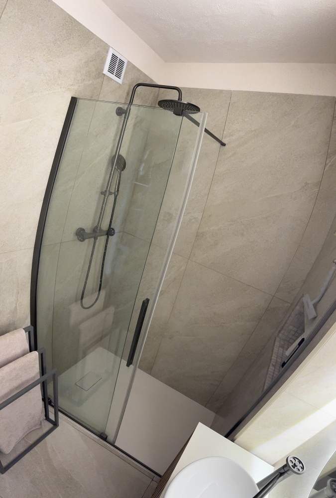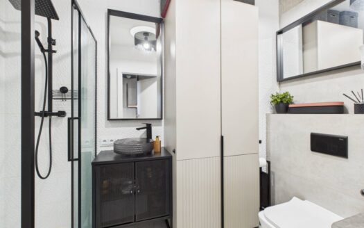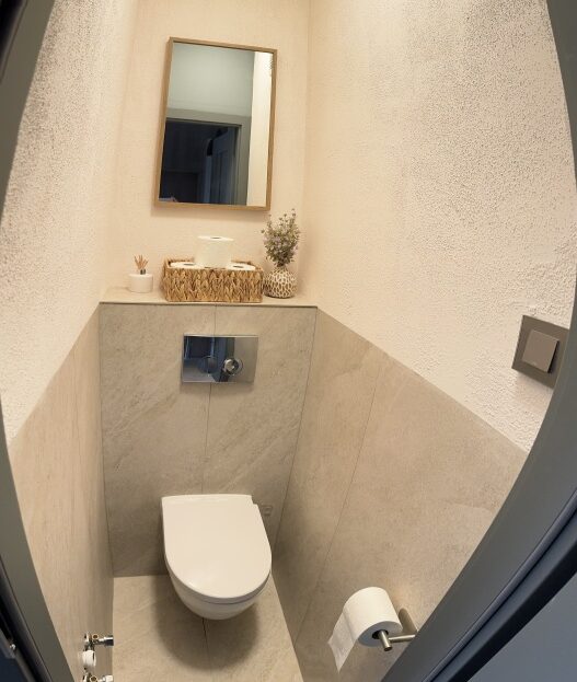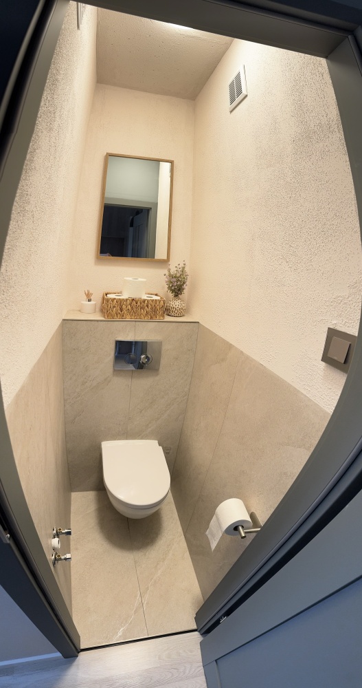 Osobno łazienka i wc wykończone wysokiej jakości gresem, blat ze spieku kwarcowego, wszystkie baterie Laveo Muro. W wc przygotowana instalacja do montażu mini umywalki( jest kupiona Villeroy&Boch wraz z baterią jak w reszcie mieszkania oraz odpływ w kolorze grafitowym)