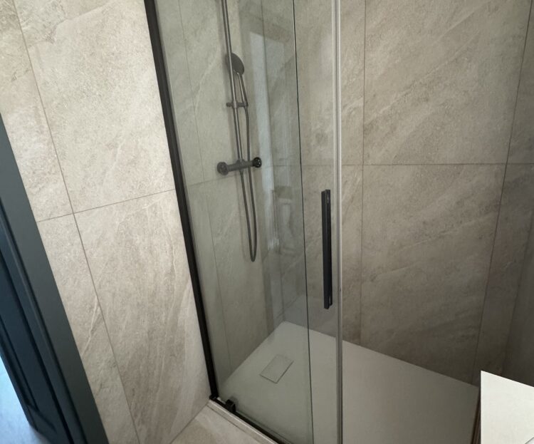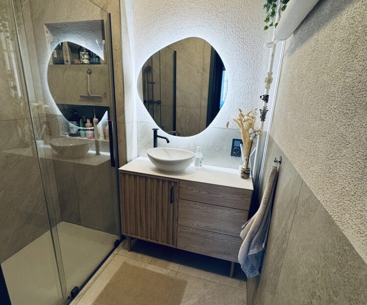Osobno łazienka i wc wykończone wysokiej jakości gresem, blat ze spieku kwarcowego. W wc przygotowana instalacja do montażu mini umywalki (jest kupiona Villeroy&Boch wraz z baterią jak w reszcie mieszkania oraz odpływ w kolorze grafitowym)