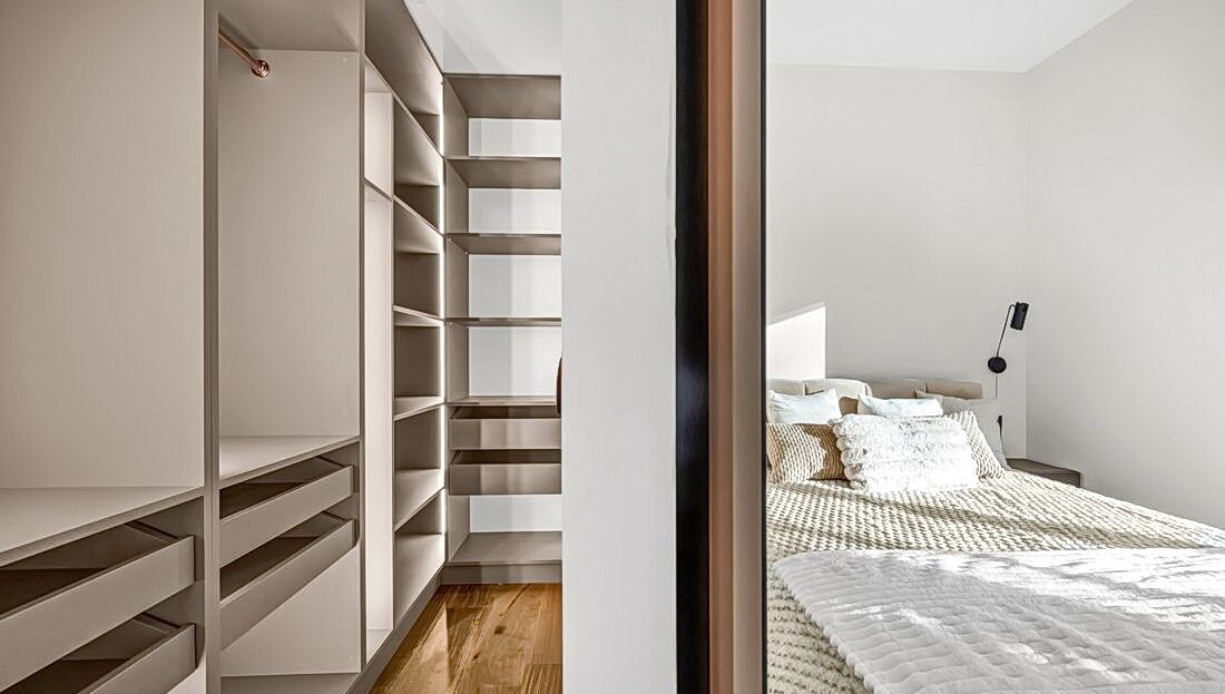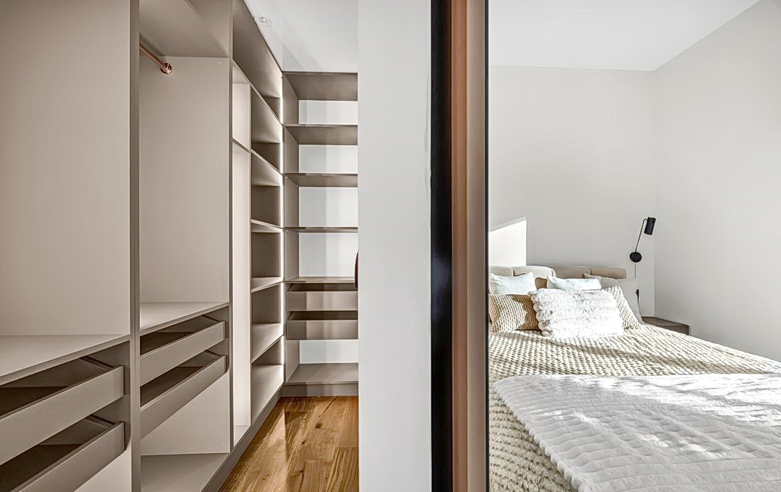 Rozkład pomieszczeń:Elegancki aneks z wyjściem na balkon, zabudową pod sufit z dymionym szkłem oraz naturalnym blatem kwarcytowym ze zintegrowanym zlewem.