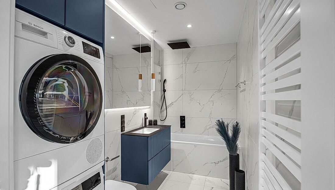 Luksusowa łazienka z nowoczesną armaturą, pralką i suszarką oraz osobna toaleta dla gości — wszystko urządzone z dbałością o każdy detal.