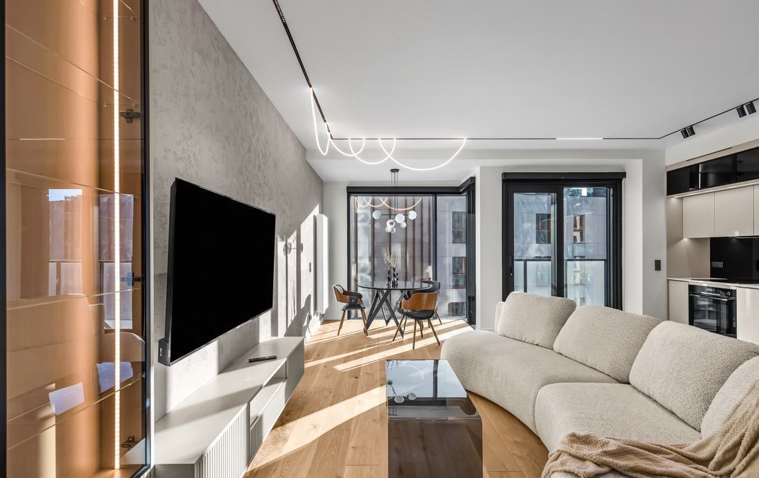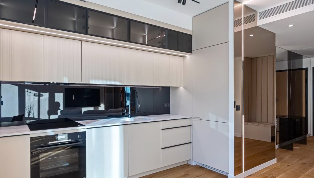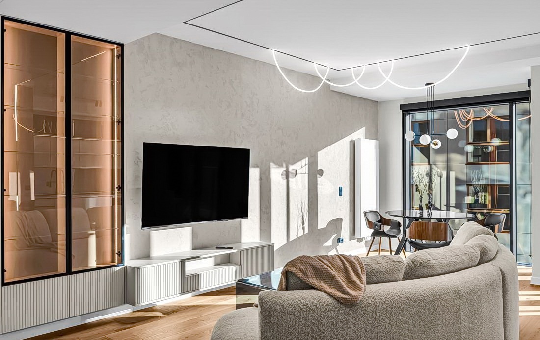 Elegancki salon z aneksem kuchennym z wyjściem na balkon, zabudową pod sufit z dymionym szkłem oraz naturalnym blatem kwarcytowym ze zintegrowanym zlewem.