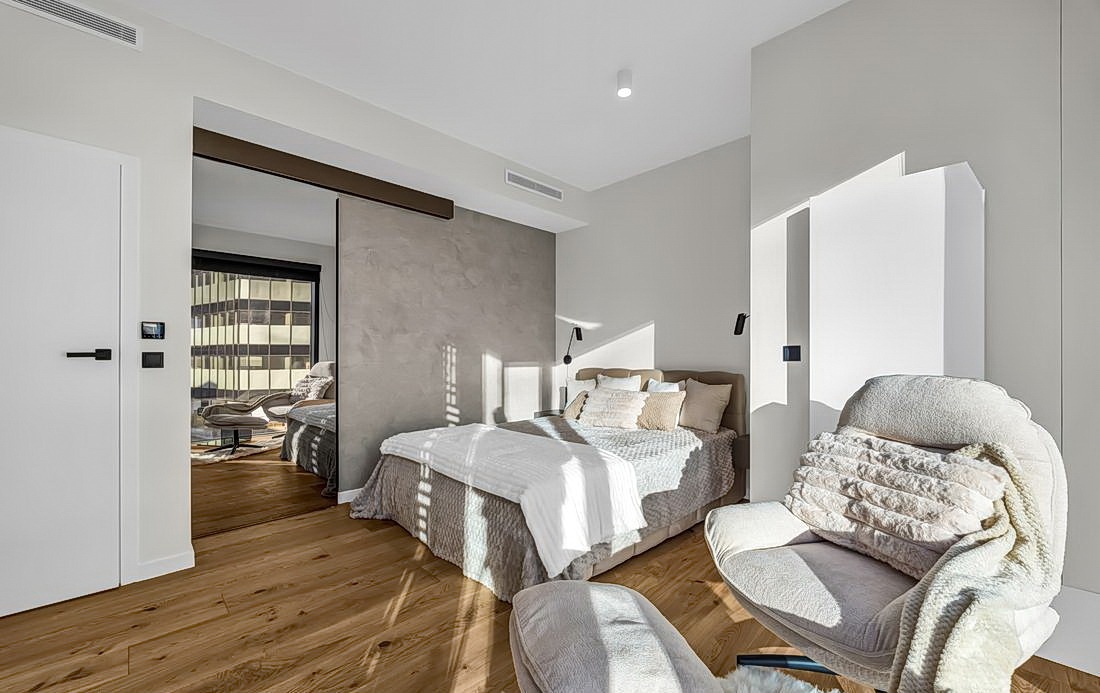 Przestronna, z podwójnym łóżkiem, toaletką i strefą relaksu. Do prywatnej garderoby prowadzą lustrzane drzwi, a dalej ściana wykończona tynkiem dekoracyjnym z efektem głębi.
