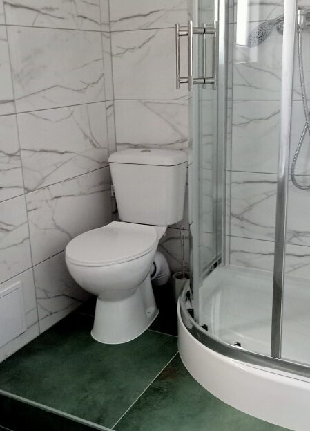 Łazienka z wc, 3,95m2, również w glazurze i terakocie.