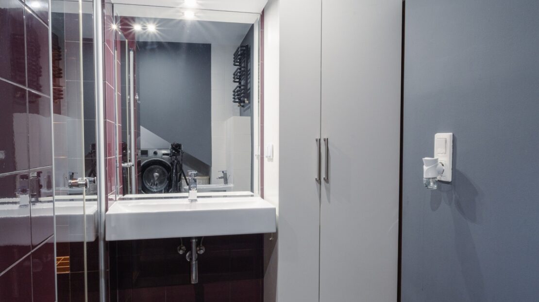 Łazienka z wc(7 m²) – z wybudowanym prysznicem, bidetem dużą umywalką, szafą na ręczniki, chemię i kosmetyki i miejscem na pralkę oraz suszarkę