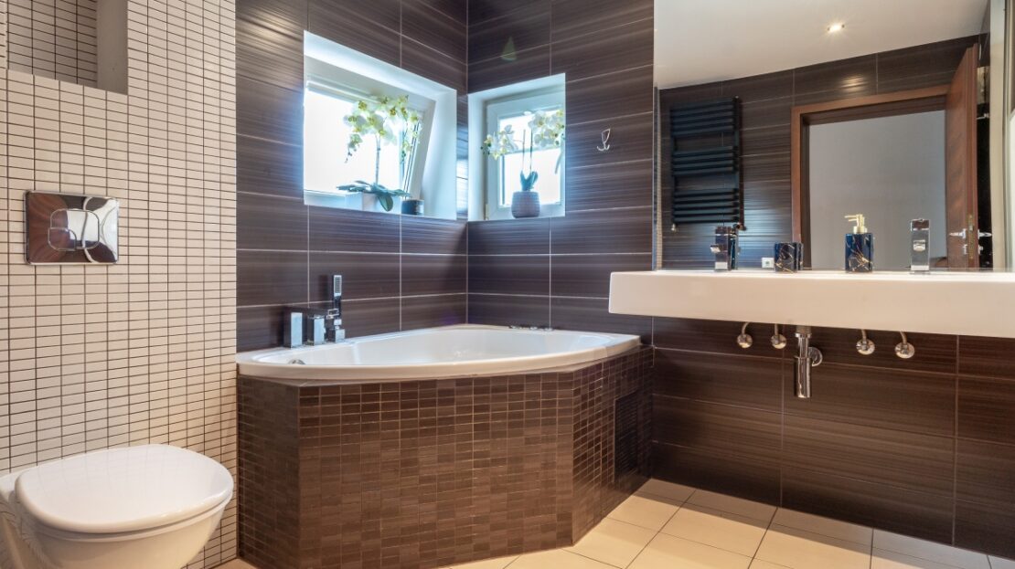 Łazienka (4,65 m²) – z podwójną umywalką, dwoma oknami, wnękową szafą i wanną z jacuzzi