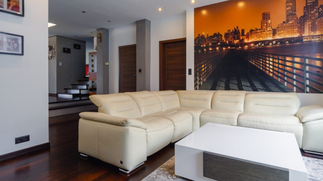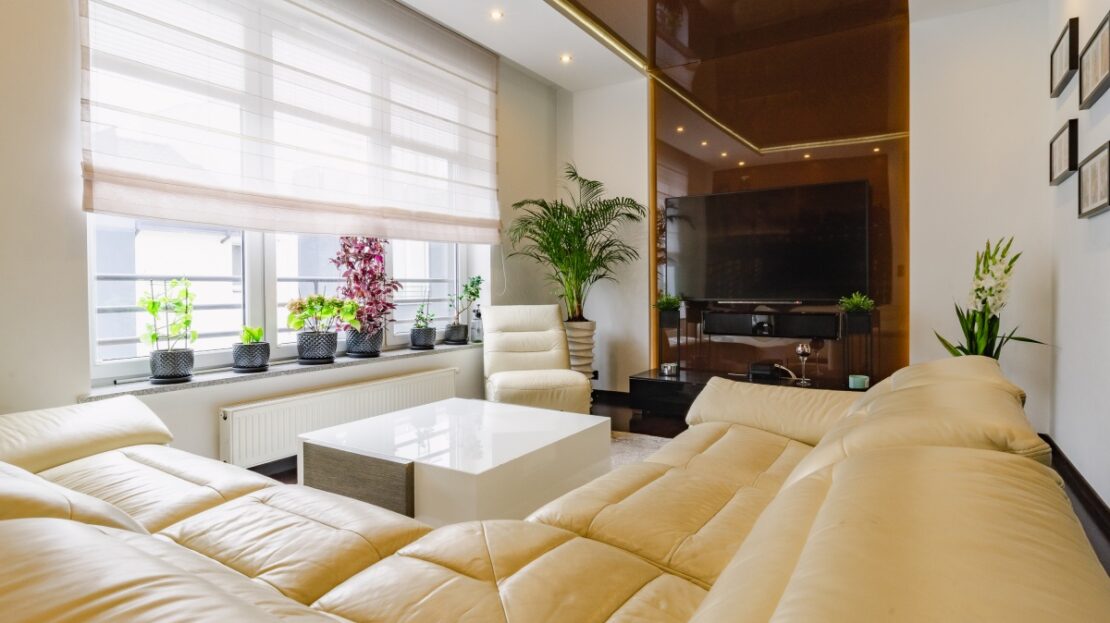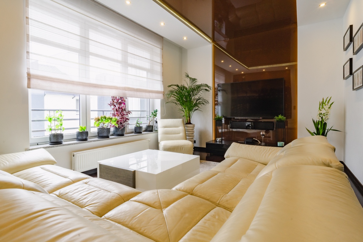 Salon (25 m²) – przestronny, z eleganckim sufitem napinanym oraz skórzanym narożnikiem z funkcją relaks
