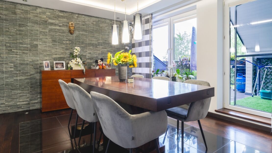Jadalnia (21 m²) – z dużym stołem, komodą i barkiem, ozdobiona naturalnym kamieniem
