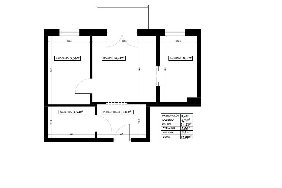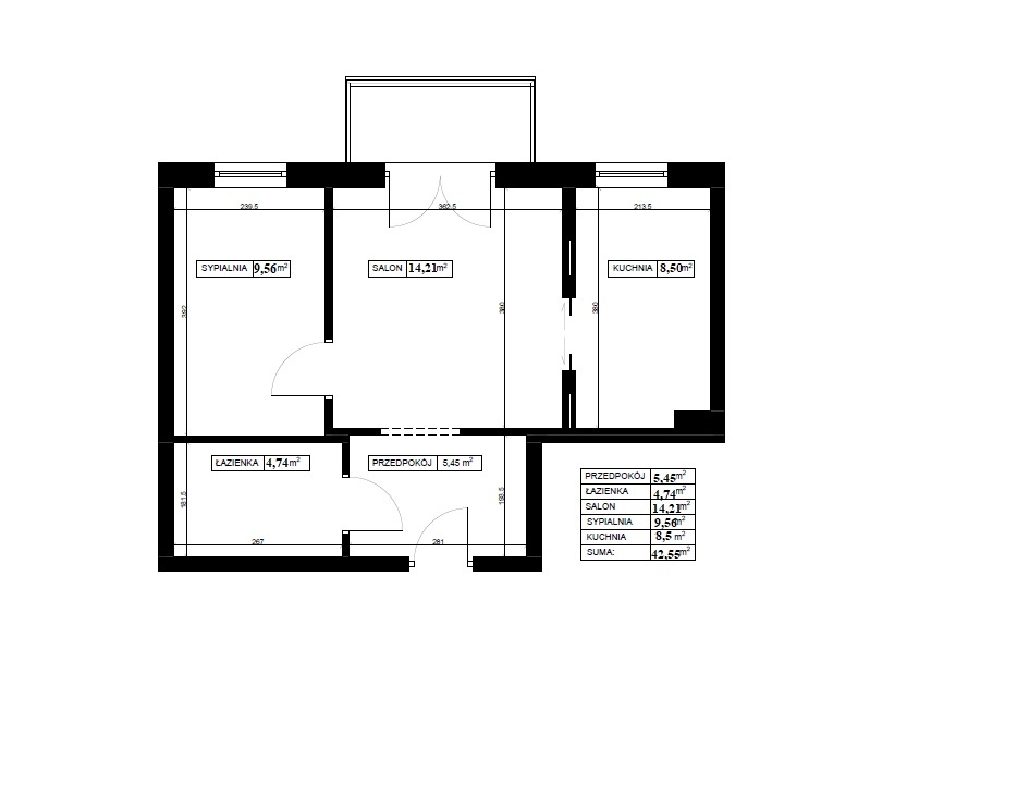 Łączna powierzchnia mieszkania wynosi 42,55 m2.