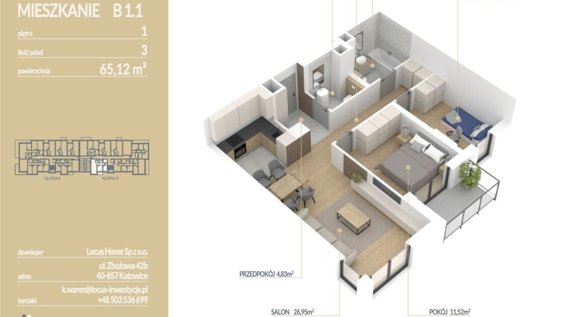Przedstawiamy ofertę mieszkania 3 – pokojowego o powierzchni 65,12 m² z balkonem, zlokalizowanego na pierwszym piętrze budynku, oznaczonego nr B 1.1