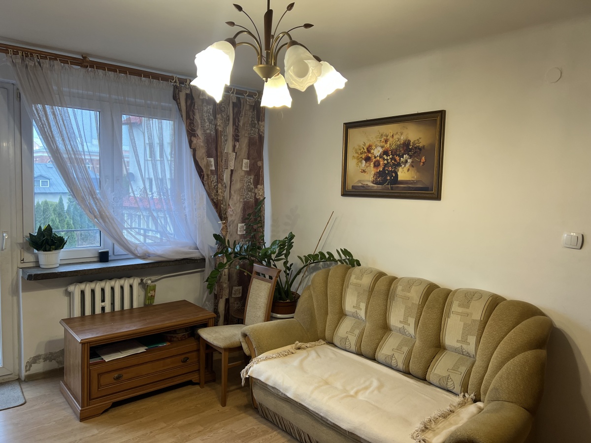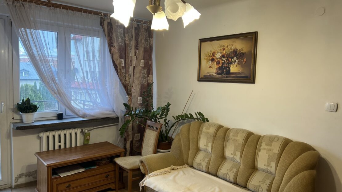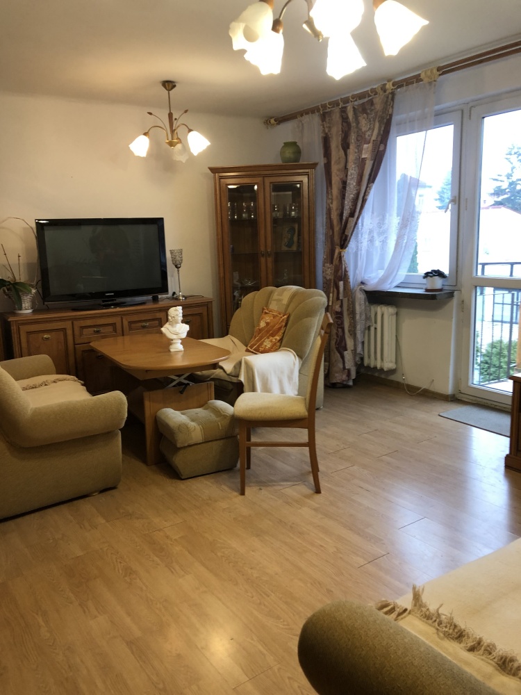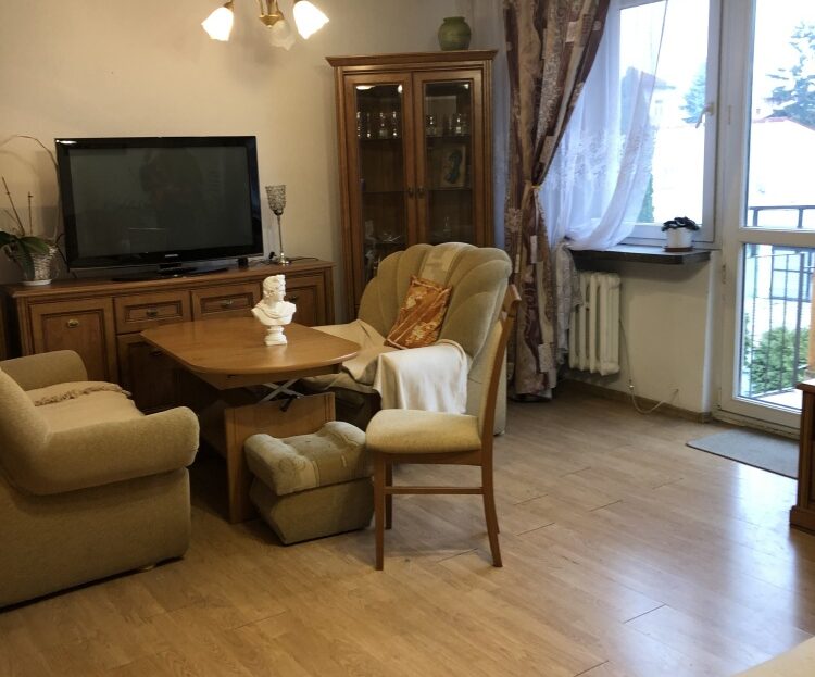 Mieszkanie położone jest blisko centrum miasta oraz instytucji publicznych (urząd miasta, starostwo, dom kultury). Innym atutem jest przestronny i ustawny salon oraz położenie na pierwszym piętrze. Mieszkanie wymaga odświeżenia. Stan prawny – lokal na własność z księgą wieczystą.