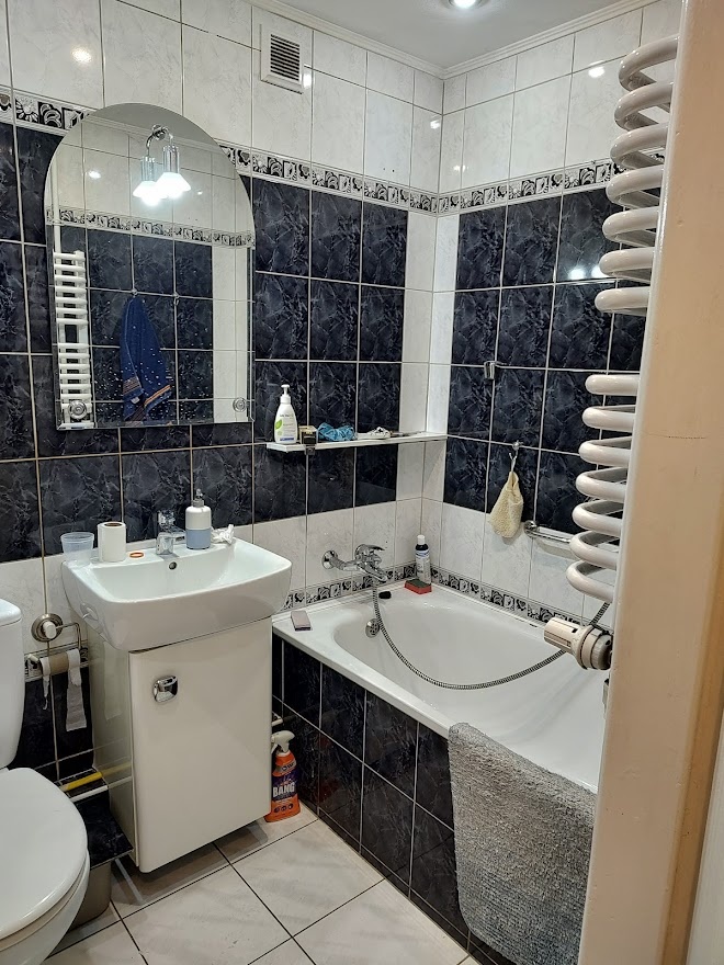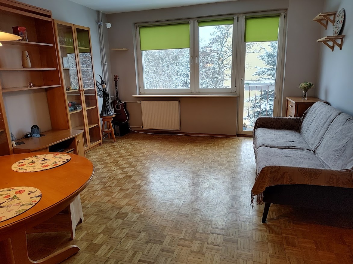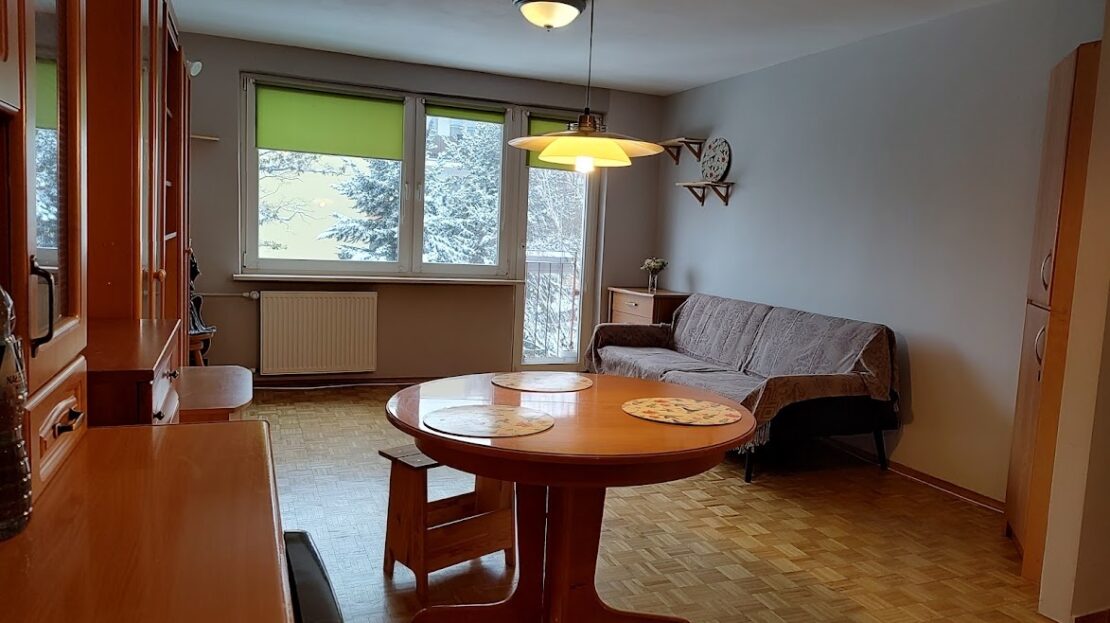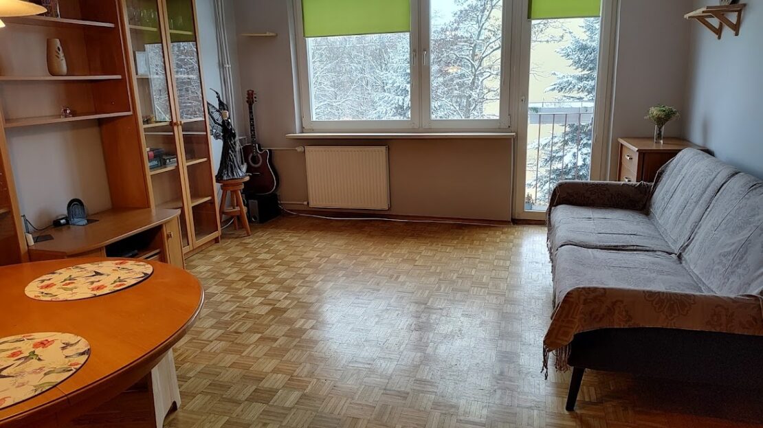 Wynajmę mieszkanie 3-pokojowe o pow. 46,3m2 z kuchnią w aneksie na 2. piętrze w 4.piętrowym budynku na os. Niedźwiadek przy ul. Wojciechowskiego. Nie ma balkonu – jest kratka balkonowa.