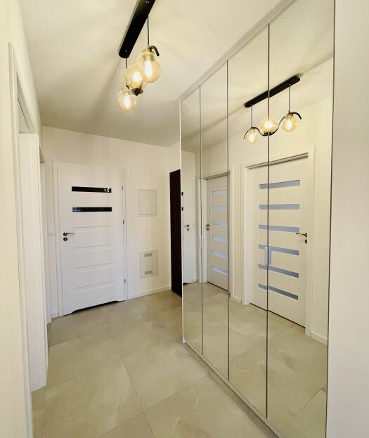 – przedpokoju (domofon, podwójna szafa w zabudowie z lustrem),