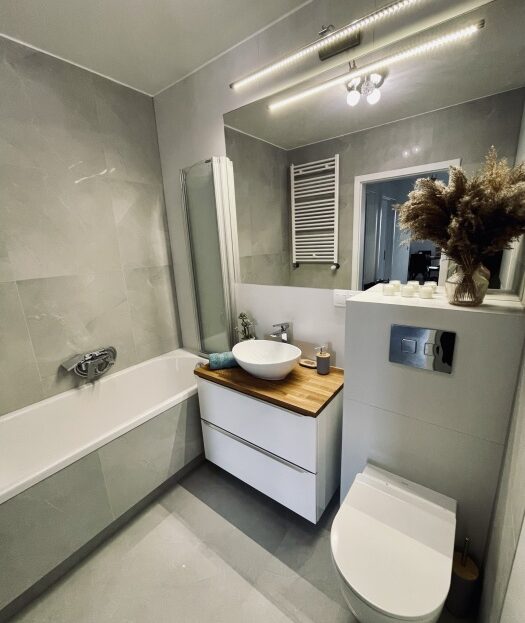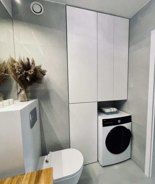 – łazienki (wanna ze szklanym parawanem, WC, umywalka z szafką, pralka, zabudowana szafa),