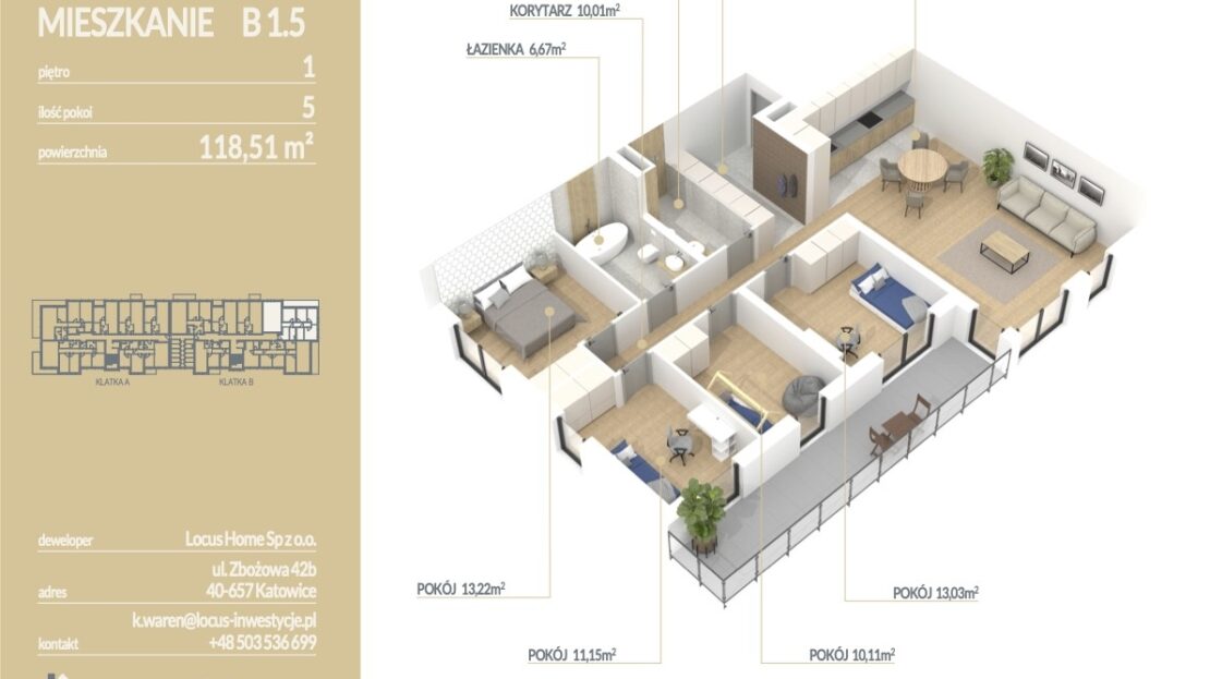 Przedstawiamy ofertę mieszkania 5 – pokojowego o powierzchni 118,51 m² z balkonem, zlokalizowanego na pierwszym piętrze budynku, oznaczonego nr B 1.5