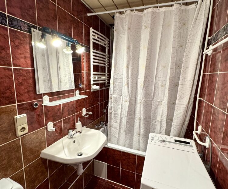 – łazienka z wanną oraz zasłoną prysznicową i pralką