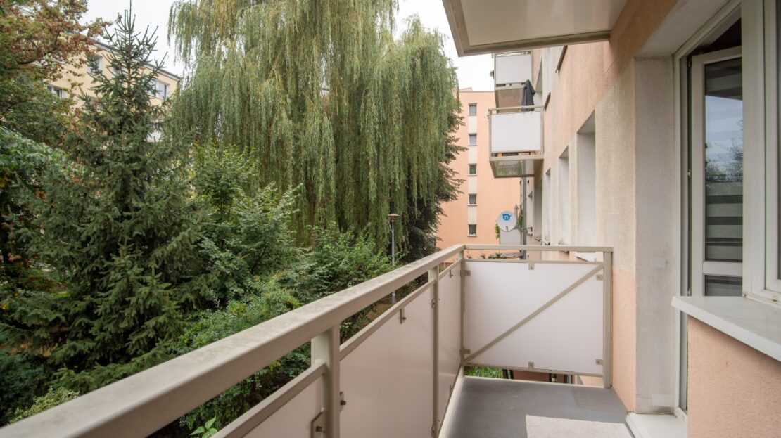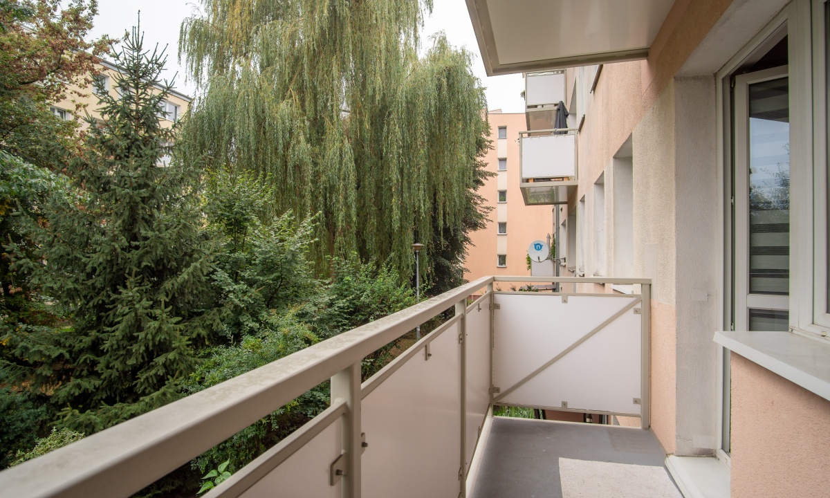 Balkon wychodzący na zieleń daje codzienny kontakt z naturą i poczucie prywatności.