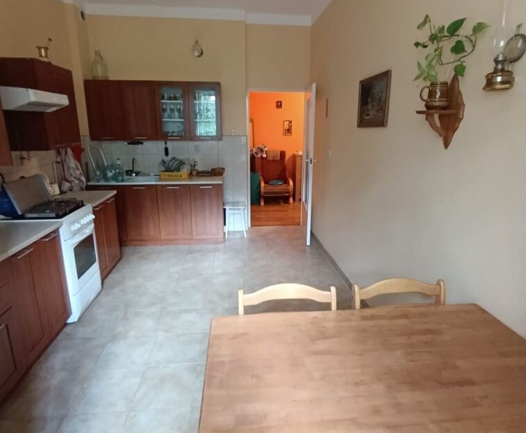 Ogrzewanie centralne, ciepła woda z sieci, zimną wodą, kuchenka elektryczna.