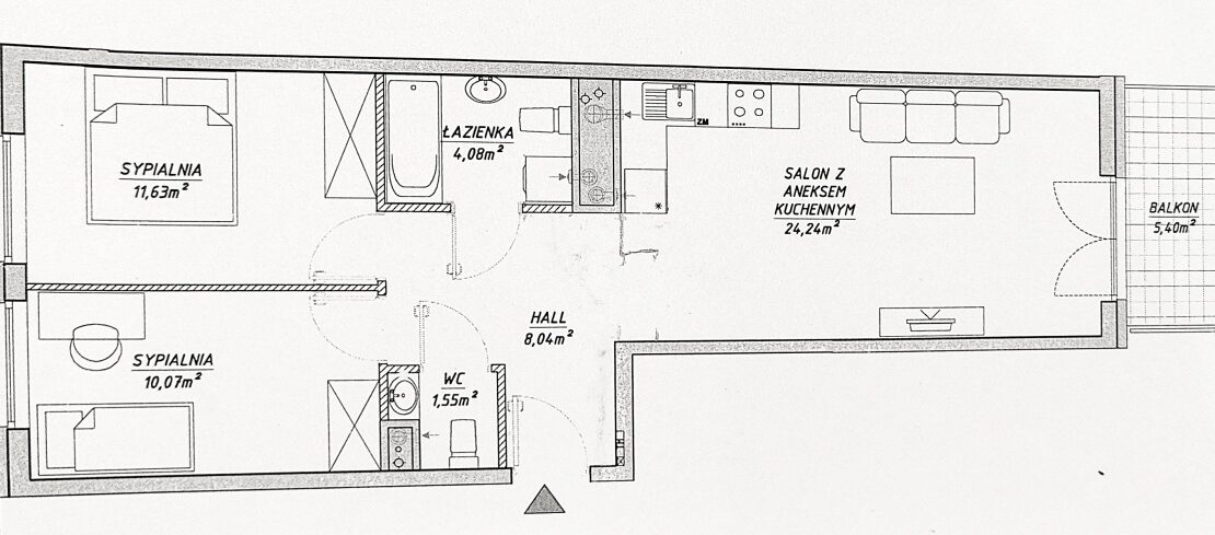 Salon z aneksem kuchennym, dwie sypialnie, łazienka, schowek (z możliwością przekształcenia w toaletę), przedpokój.