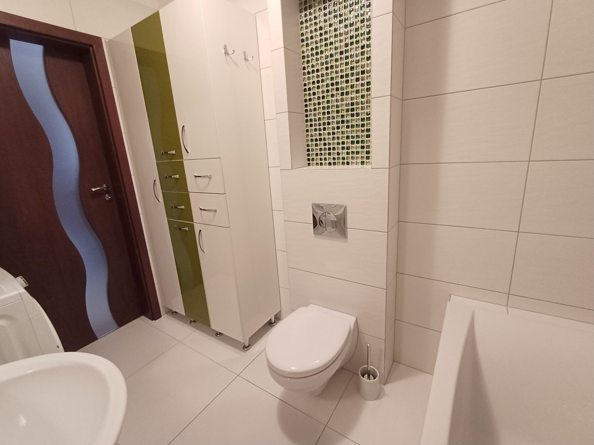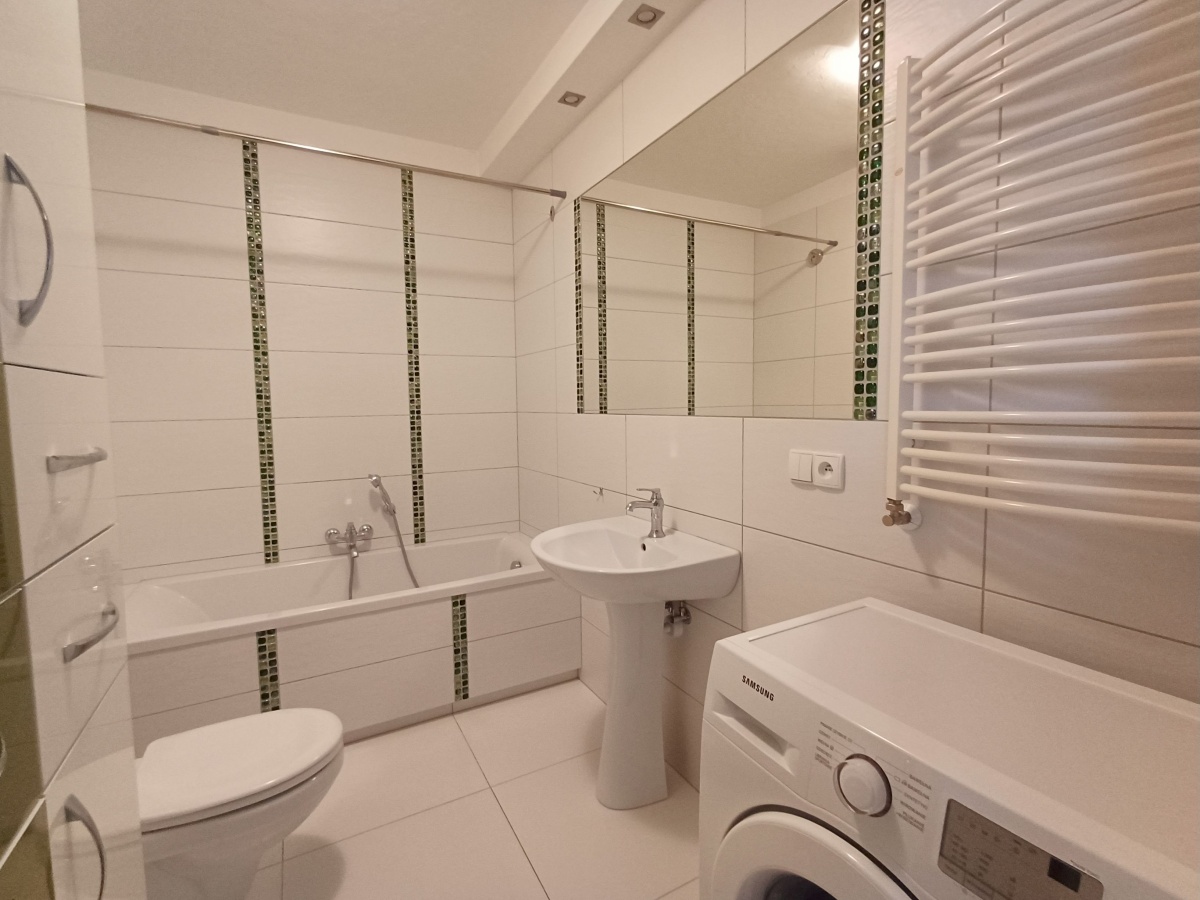 Mieszkanie jest w idealnym stanie (tylko do odmalowania). Meble (w kuchni, łazience, pokoju, garderobie i przedpokoju), podłogi i wyposażenie kuchni wyglądają tak, jakby nigdy nie były używane. Wszystko powyższe jest w cenie mieszkania.