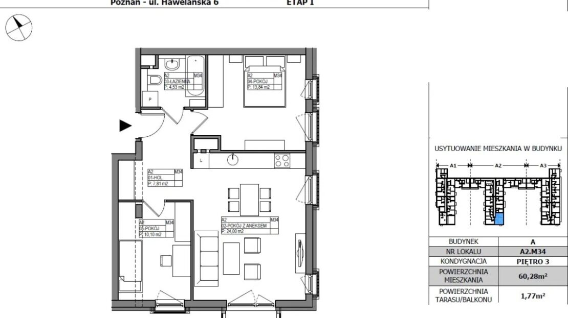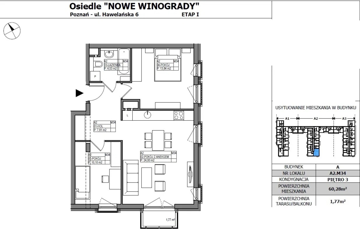 Sprzedam jasne, narożnikowe mieszkanie 3-pokojowe (60,20m²) położone na zamkniętym osiedlu przy ul. Hawelańskiej (wjazd do osiedla przez szlaban).