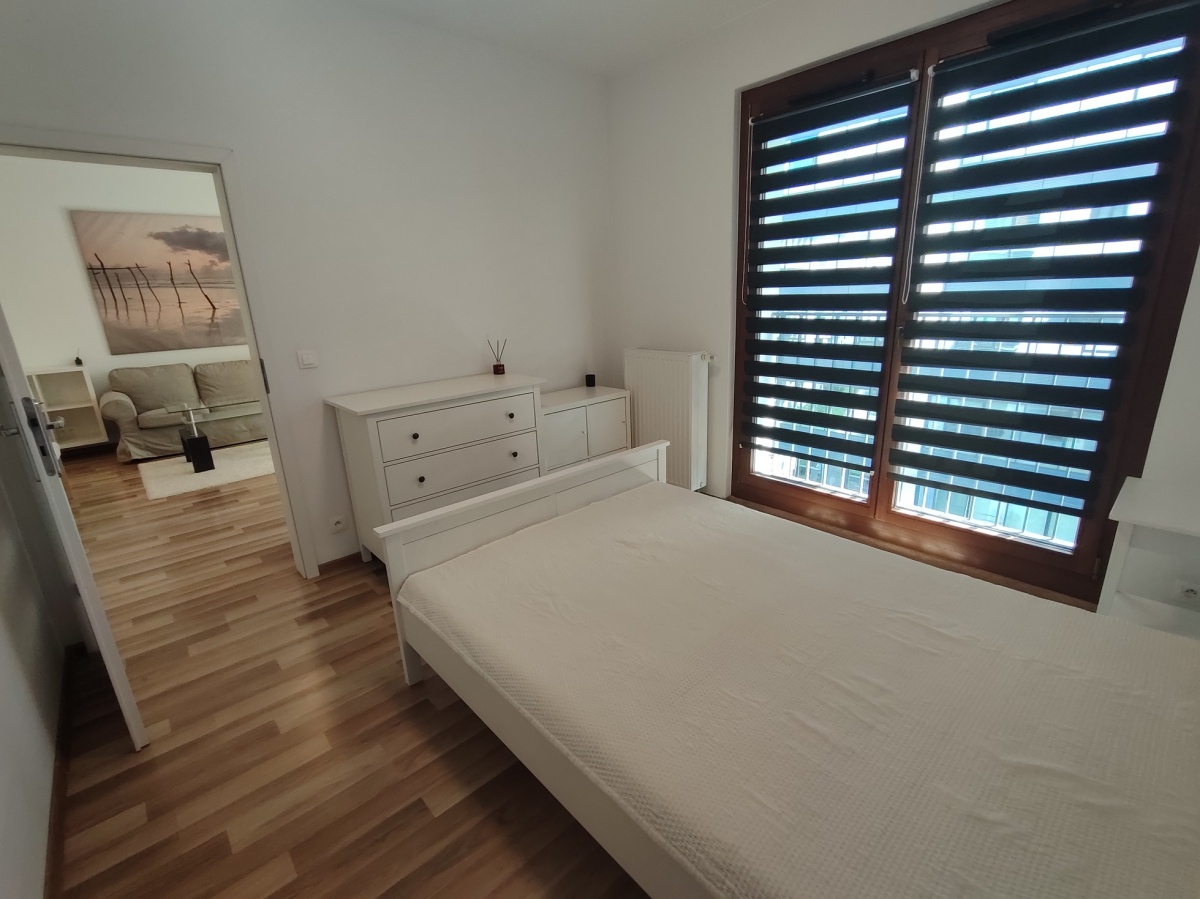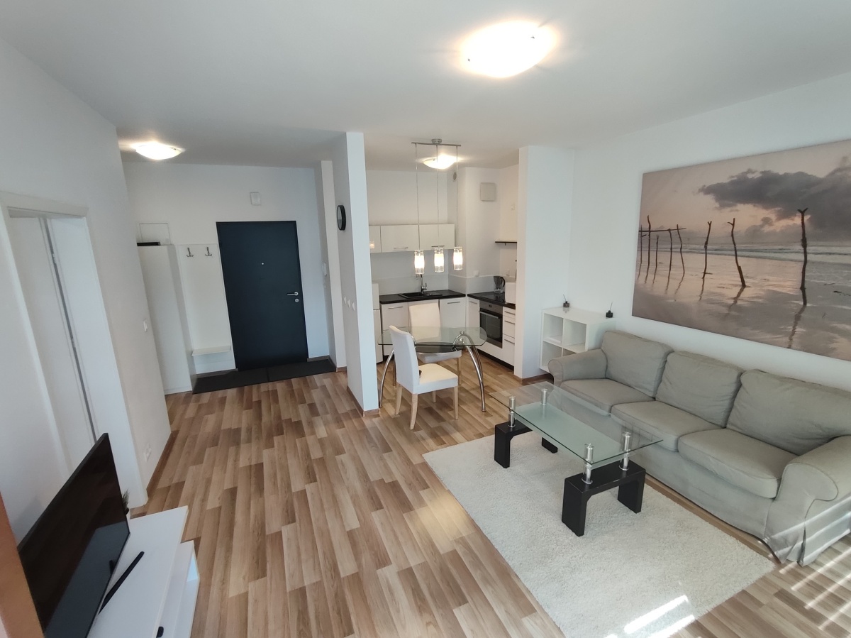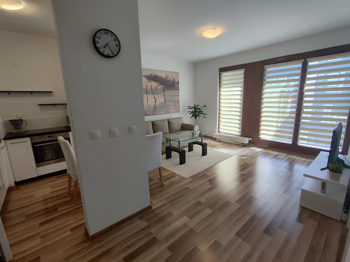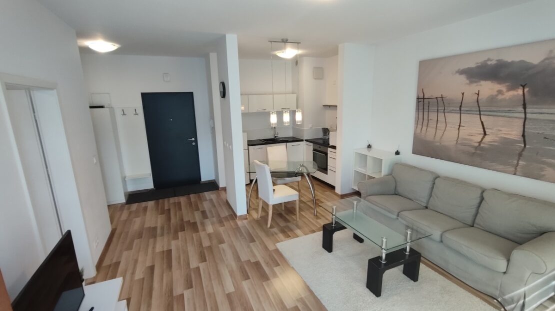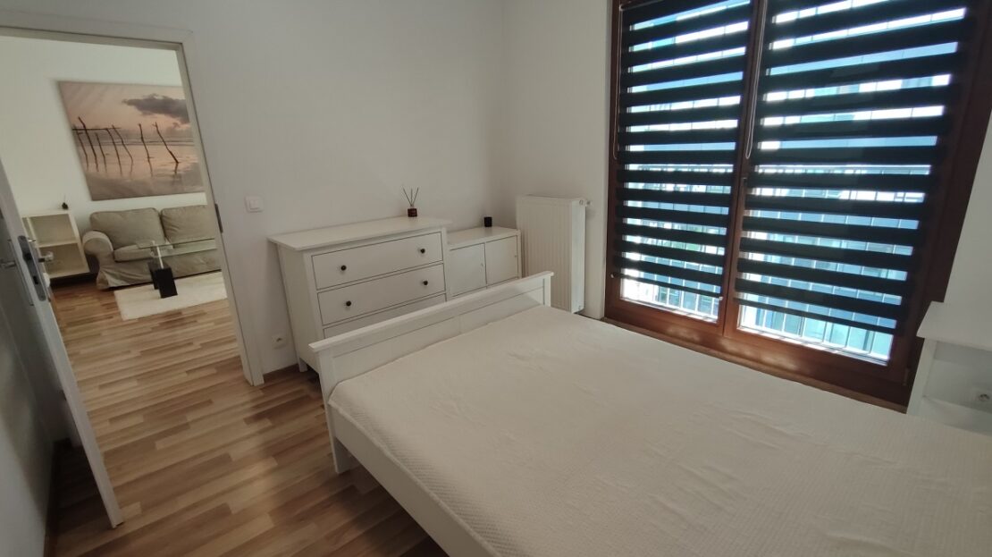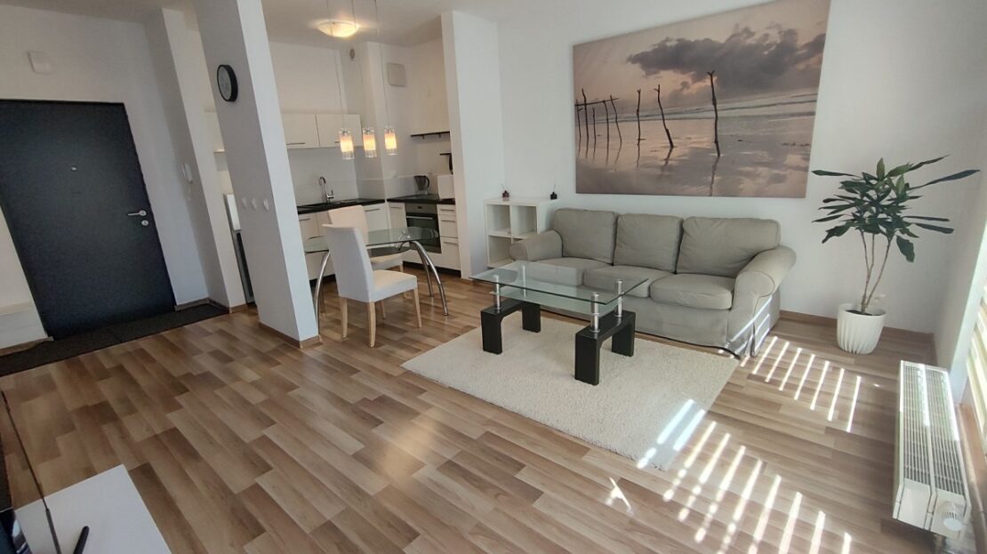 Mieszkanie ciche, od strony wewnętrznego patio i zachodniej strony: pokój dzienny z aneksem kuchennym (20 m2), sypialnia (15 m2), łazienka z WC (5 m2). Z pokoju dziennego wyjście na ( 8 m2) loggię. Salon umeblowany: rozkładany narożnik, szafka pod telewizor, TV.