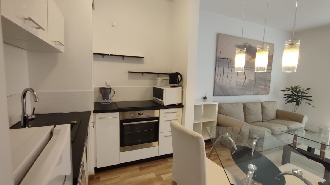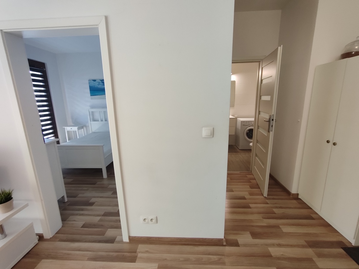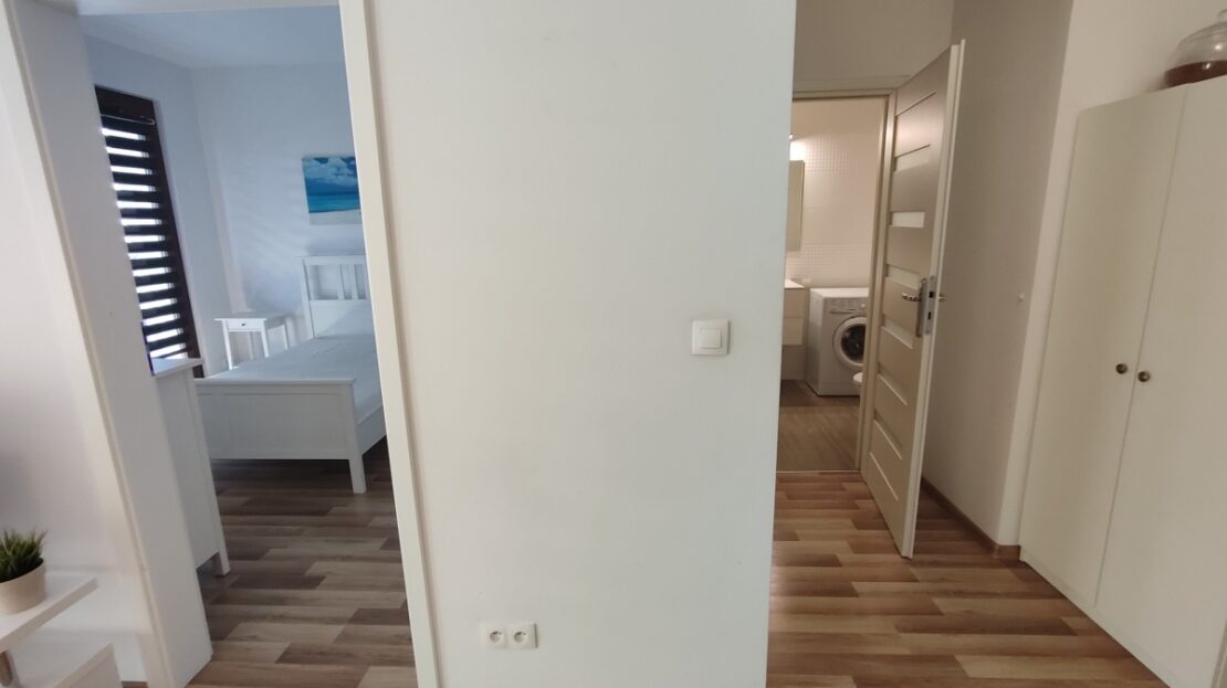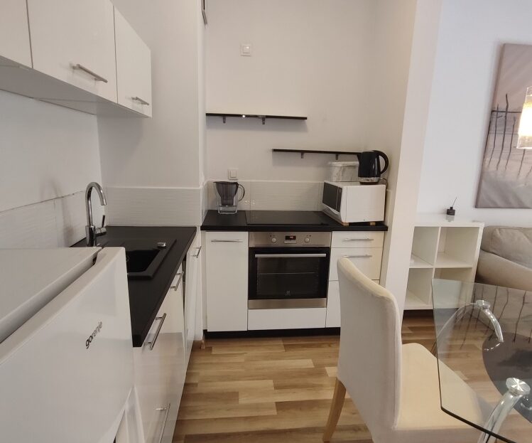 Aneks kuchenny w pełni wyposażony z nowoczesnym sprzętem AGD (kuchenka z płytą indukcyjną i piekarnikiem elektrycznym, okap, lodówko-zamrażarka, zmywarka, kuchenka mikrofalowa); w części kuchennej znajduje się również stół z krzesłami i ława szklana W sypialni wygodne 2-os. łóżko. Łazienka z WC, wanną z funkcją prysznica oraz pralką. W przedpokoju zabudowa na wymiar z szafą i szafkami. Okna drewniane z roletami . Ogrzewanie i ciepła woda z sieci miejskiej; brak gazu. Na wyposażeniu deska do prasowania, żelazko, suszarka do włosów, odkurzacz.