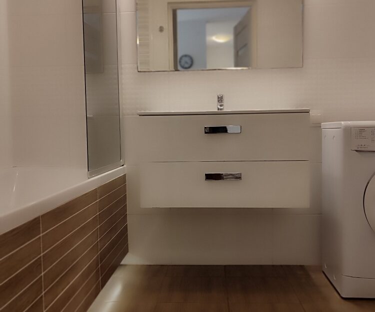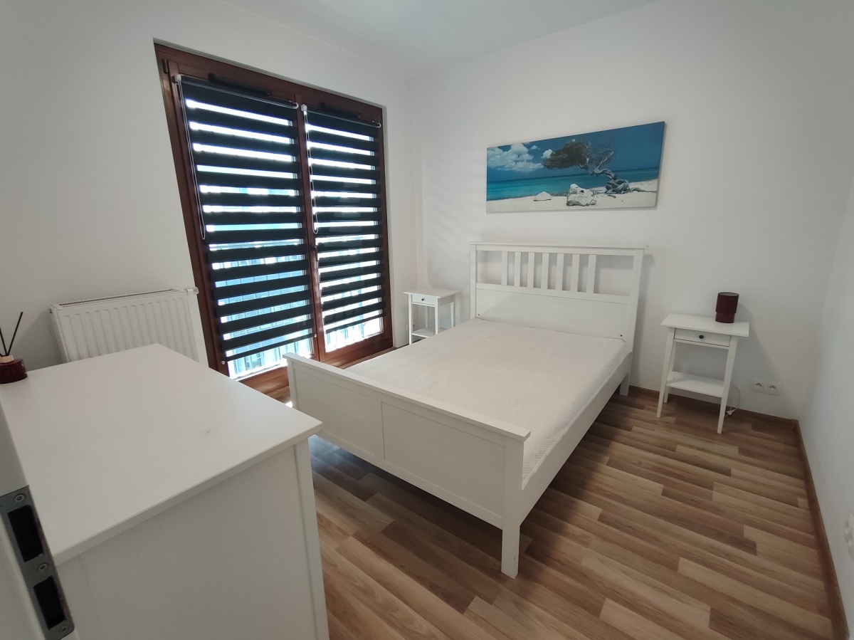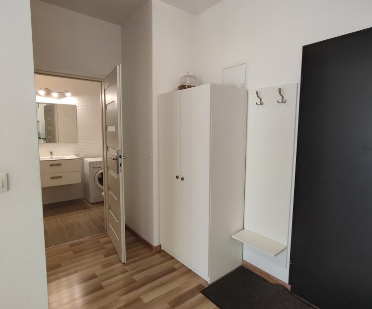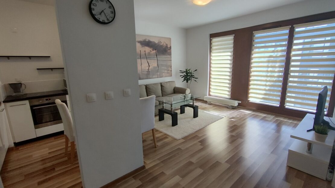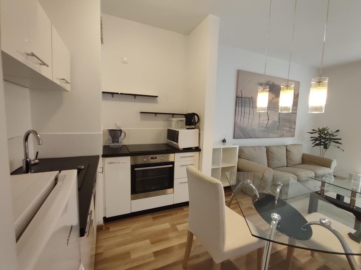 Aneks kuchenny w pełni wyposażony z nowoczesnym sprzętem AGD (kuchenka z płytą indukcyjną i piekarnikiem elektrycznym, okap, lodówko-zamrażarka, zmywarka, kuchenka mikrofalowa); w części kuchennej znajduje się również stół z krzesłami i ława szklana W sypialni wygodne 2-os. łóżko. Łazienka z WC, wanną z funkcją prysznica oraz pralką. W przedpokoju zabudowa na wymiar z szafą i szafkami. Okna drewniane z roletami . Ogrzewanie i ciepła woda z sieci miejskiej; brak gazu. Na wyposażeniu deska do prasowania, żelazko, suszarka do włosów, odkurzacz.