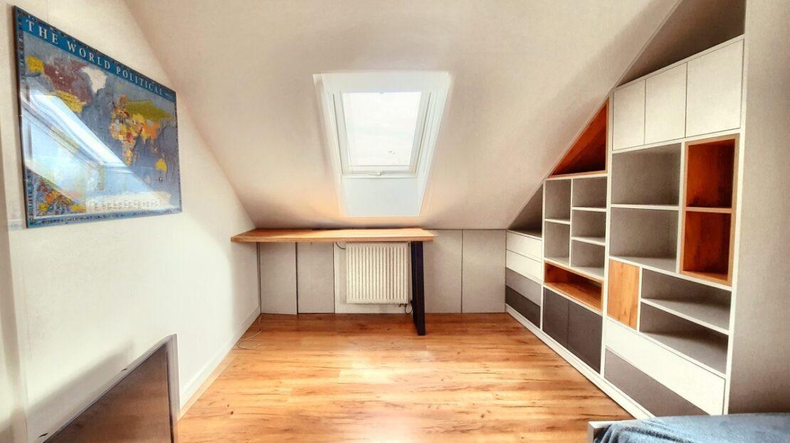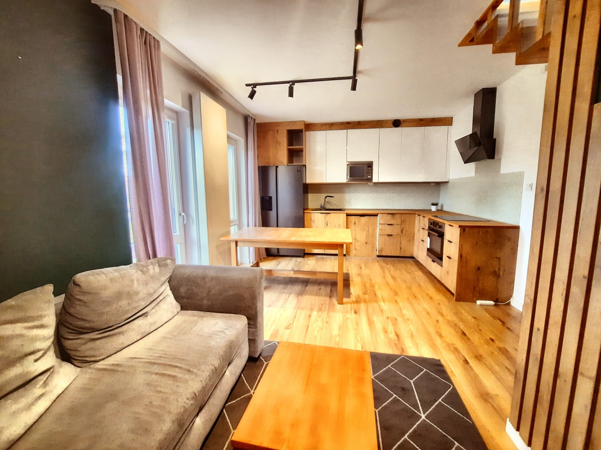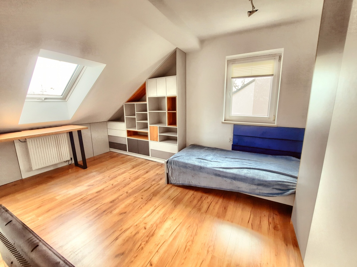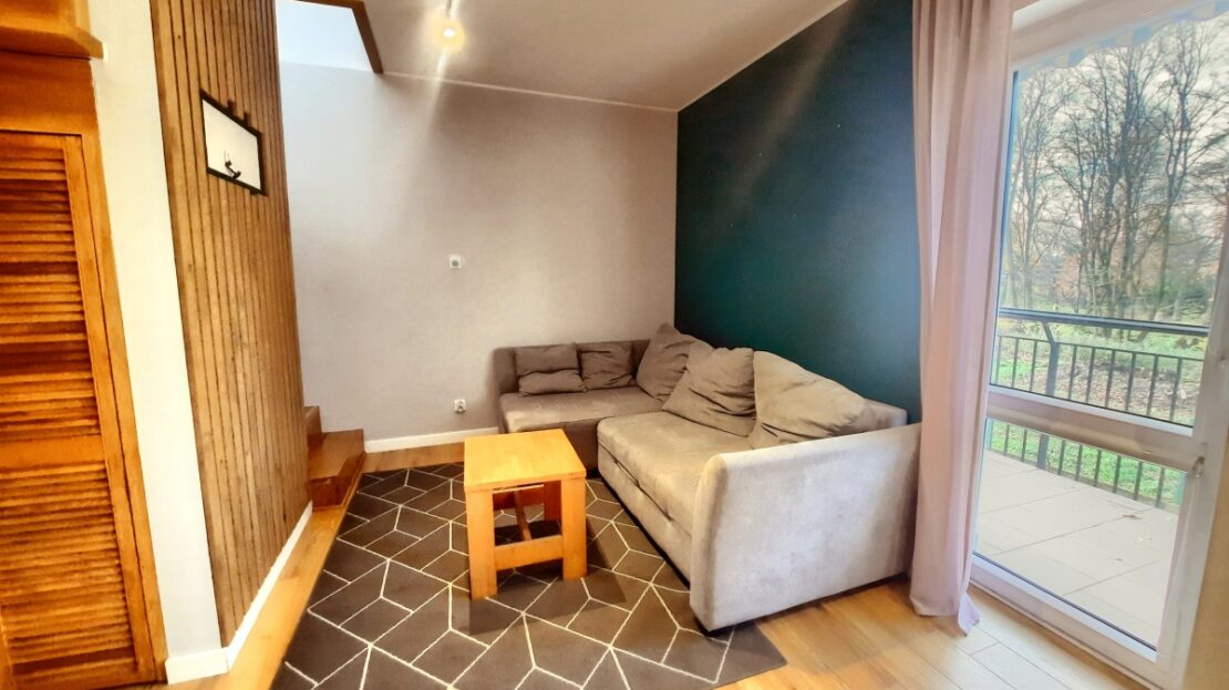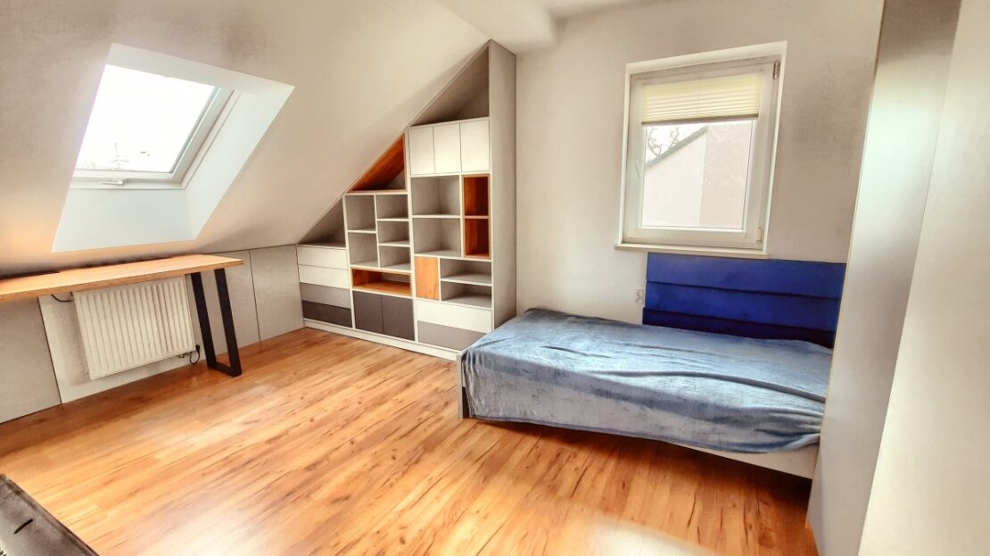 Mieszkanie na pierwszym piętrze i poddaszu jedno piętrowego budynku z 2008 roku. Do mieszkania przynależy ogródek i dwa miejsca postojowe na terenie wspólnoty. Miejsca dodatkowo płatne – łączna cena miejsc 50 000 złotych.